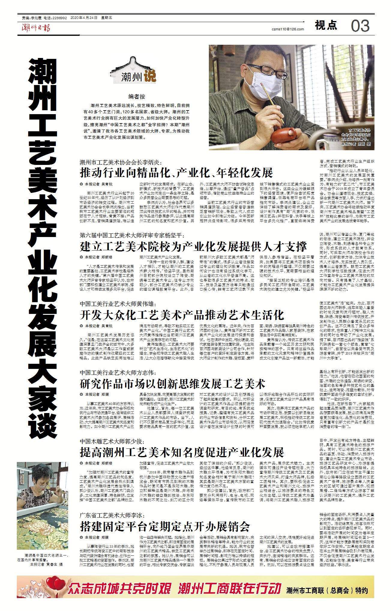 潮州工藝美術(shù)源遠(yuǎn)流長,技藝精致、特色鮮明,目前擁有40多個工藝門類,120多名國家、省級大師。潮州的工藝美術(shù)行業(yè)擁有巨大的發(fā)展?jié)摿Γ绾渭涌飚a(chǎn)業(yè)化轉(zhuǎn)型升級,擦亮潮州“中國工藝美術(shù)之都”金字招牌?本期“潮州說”,邀請了我市各工藝美術(shù)領(lǐng)域的大師、專家,為推動我市工藝美術(shù)產(chǎn)業(yè)化發(fā)展出謀劃策。