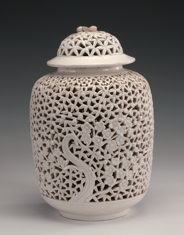 通花瓷花是以鏤空、捏塑技法為主的傳統(tǒng)技藝,是楓溪瓷燒制技藝中最具代表性的傳統(tǒng)技藝。通花瓷其主要特點(diǎn)是將瓷坯通體鏤空,或與浮雕技藝結(jié)合,或再在鏤空坯體上寄貼瓷花。瓷花捏塑技藝是陶瓷雕塑的技法之一,俗稱“拈花”,是指用手工捏塑而成各種陶瓷花卉。通花瓷經(jīng)常與捏塑瓷花相結(jié)合,稱“寄花通花”。瓷花薄如蟬翼、細(xì)巧如絲,通花瓷加貼瓷花,融成一體,相托相映,巧奪天工,令人賞心悅目。