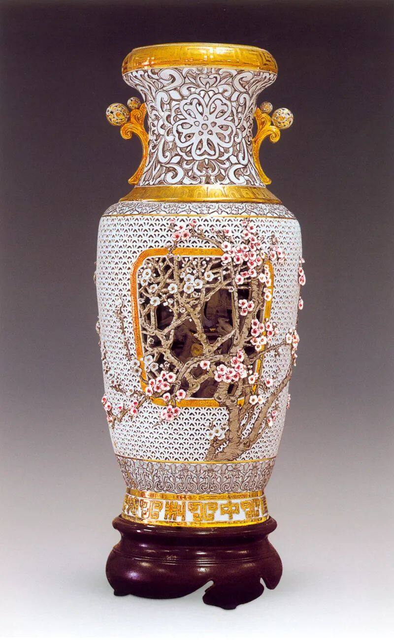三層通雕《友誼》通花瓶,高1.3米,分內(nèi)、中、外三層,內(nèi)層為鏤空的粉蝶圖案,中層為布滿牡丹花、芍藥花、玉蘭花、玫瑰花、菊花、繡球花等鮮花的百花藍(lán),外層為鏤空瓶壁,瓶壁上貼塑盛開的梅花。花瓶運(yùn)用了通雕、浮雕、貼塑、釉彩等裝飾手法,鏤空圖案(俗稱通花目)豐富而不雜亂,花瓶頸部的鏤空圖案是傳統(tǒng)牡丹花圖案,大方端莊,與瓶頸的圖案相比,瓶身的鏤空圖案則顯精細(xì)、高雅,采用了玉蘭花為鏤空圖案,兩種通花目的運(yùn)用,既保持了潮州楓溪傳統(tǒng)通花瓷的精巧、玲瓏剔透的特點(diǎn),又有粗細(xì)變化,格調(diào)協(xié)調(diào)新穎。花瓶的上下花邊采用了大如意頭、鉤藤、木棉花等圖案,大如意頭、鉤藤都采用了敦煌壁畫的表現(xiàn)方式,木棉花則代表廣東。通花瓶中層原來設(shè)計(jì)有兩套方案,一套是布滿瓷花的花籃,一套是人物立塑,兩套方案當(dāng)時都有生產(chǎn)成品,中層為花籃的作為國禮瓷送到朝鮮,而中層為嫦娥奔月人物立塑的則收藏于潮州中國瓷都陳列館。整個花瓶,充滿中國元素,層次分明,精雕細(xì)琢,玲瓏剔透,巧奪天工,堪稱楓溪通花瓷花藝術(shù)經(jīng)典之作。