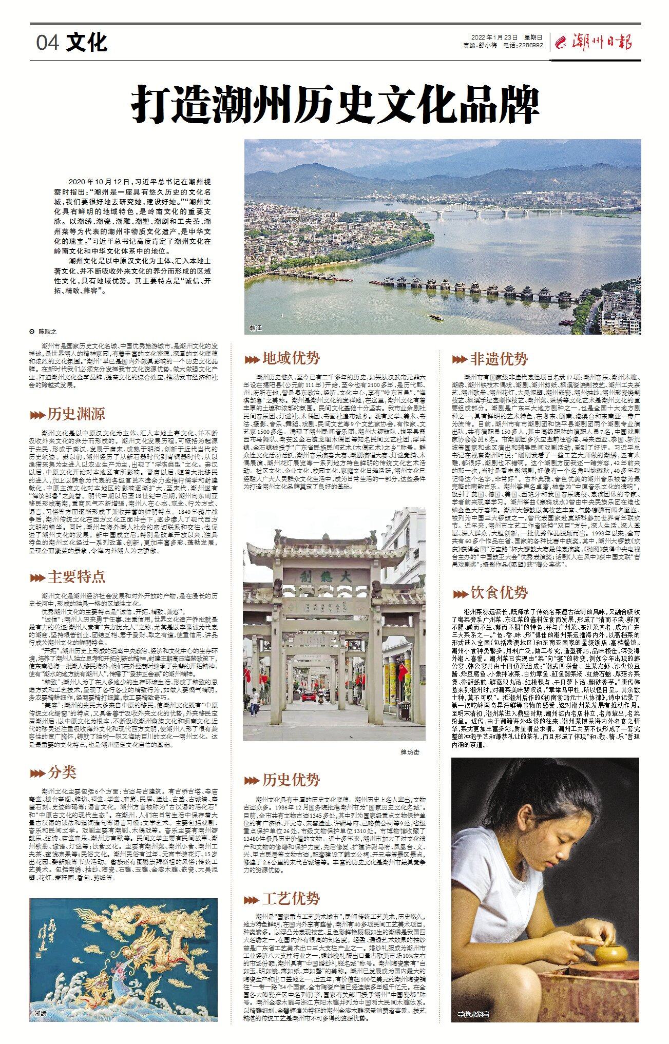 潮州市是國家歷史文化名城、中國優秀旅游城市,是潮州文化的發祥地,是世界潮人的精神家園,有著豐富的文化資源、深厚的文化底蘊和濃烈的文化氛圍。“潮州”早已是國內外頗具影響的一個歷史文化品牌。在新時代我們必須充分發揮我市文化資源優勢,做大做強文化產業,打造潮州文化金字品牌,提高文化的綜合效應,推動我市經濟和社會的跨越式發展。