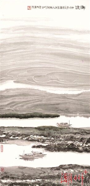 作品以純水墨繪制,潤澤淋漓,筆墨輕而不浮,情景交融,境韻悠長。值得一提的是,作品的題款:“鄉(xiāng)渡,?甲戌年(1994)春月嶺東潮人謝舸時客澳門畫院”,畫面天際這一行書寫的題款,與下面近景的酣暢墨色形成上下呼應。同時,濃墨書寫的題款和紅色的印章在整幅作品的構(gòu)圖上,頗有“四兩撥千斤”之妙,使大面積的中、遠景與近景,上下收籠,虛實相生,達到均衡,顯示了畫家在作品“經(jīng)營位置”上的匠心。