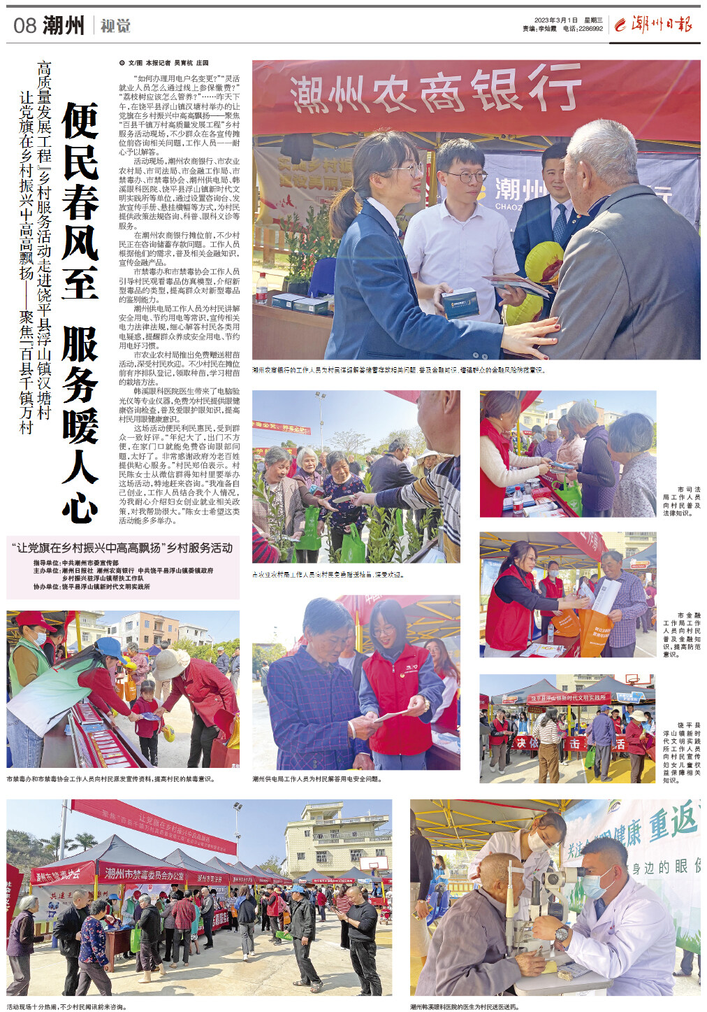 活動現場,潮州農商銀行、市農業農村局、市司法局、市金融工作局、市禁毒辦、市禁毒協會、潮州供電局、韓溪眼科醫院、饒平縣浮山鎮新時代文明實踐所等單位,通過設置咨詢臺、發放宣傳手冊、懸掛橫幅等方式,為村民提供政策法規咨詢、科普、眼科義診等服務。
