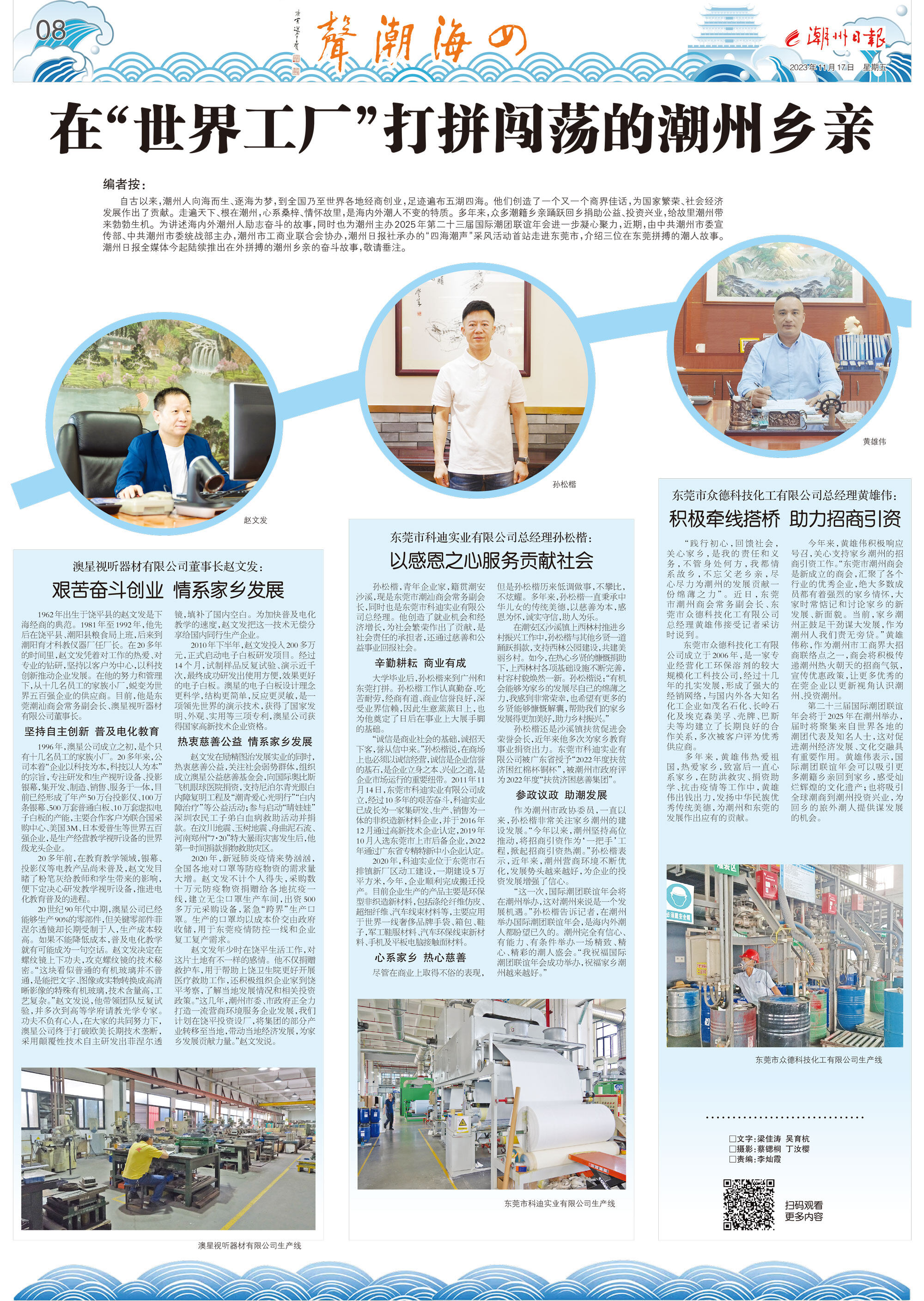 “踐行初心,回饋社會(huì),關(guān)心家鄉(xiāng),是我的責(zé)任和義務(wù),不管身處何方,我都情系故鄉(xiāng),不忘父老鄉(xiāng)親,盡心盡力為潮州的發(fā)展貢獻(xiàn)一份綿薄之力”。近日,東莞市潮州商會(huì)常務(wù)副會(huì)長、東莞市眾德科技化工有限公司總經(jīng)理黃雄偉接受記者采訪時(shí)說到。