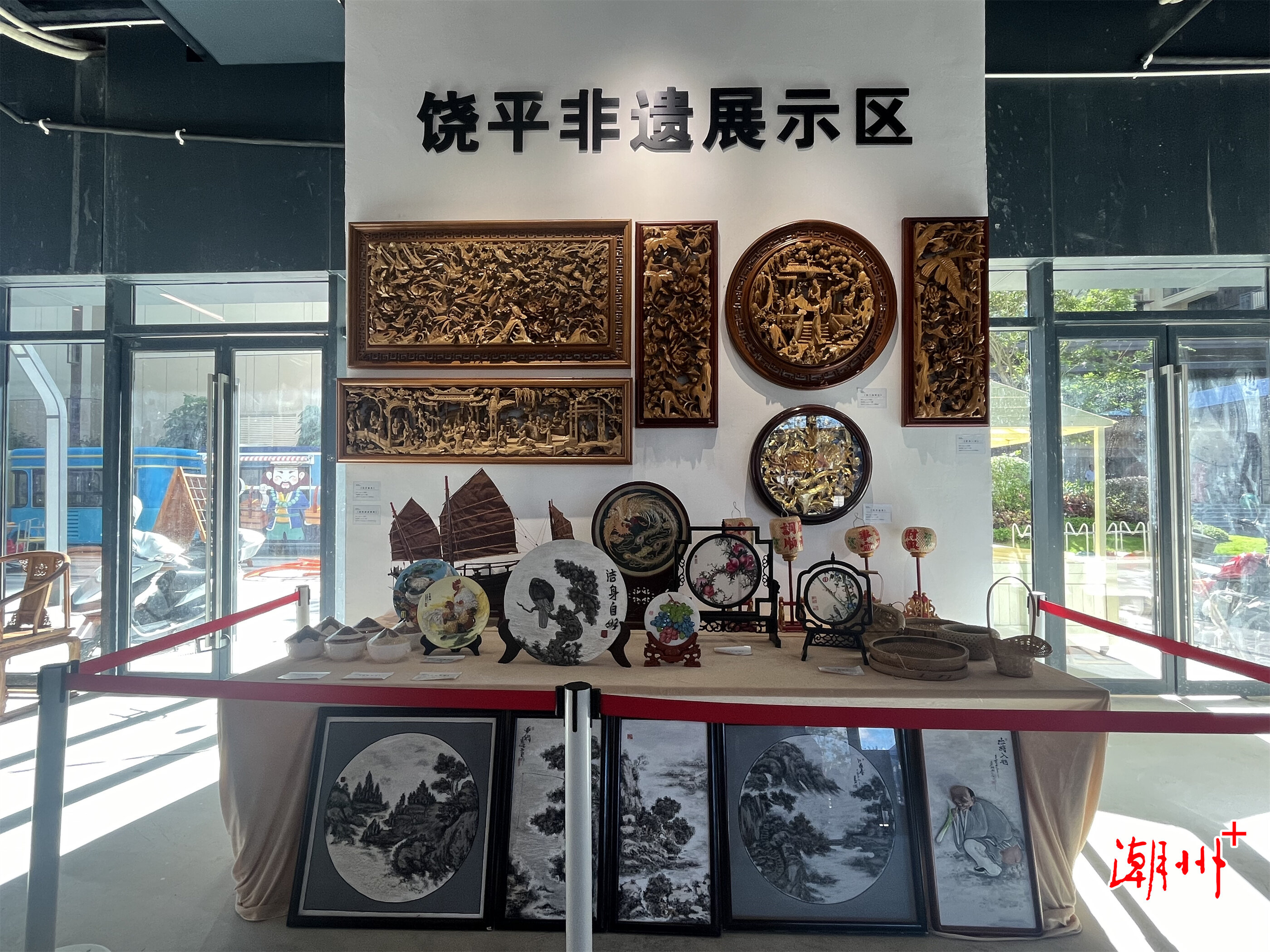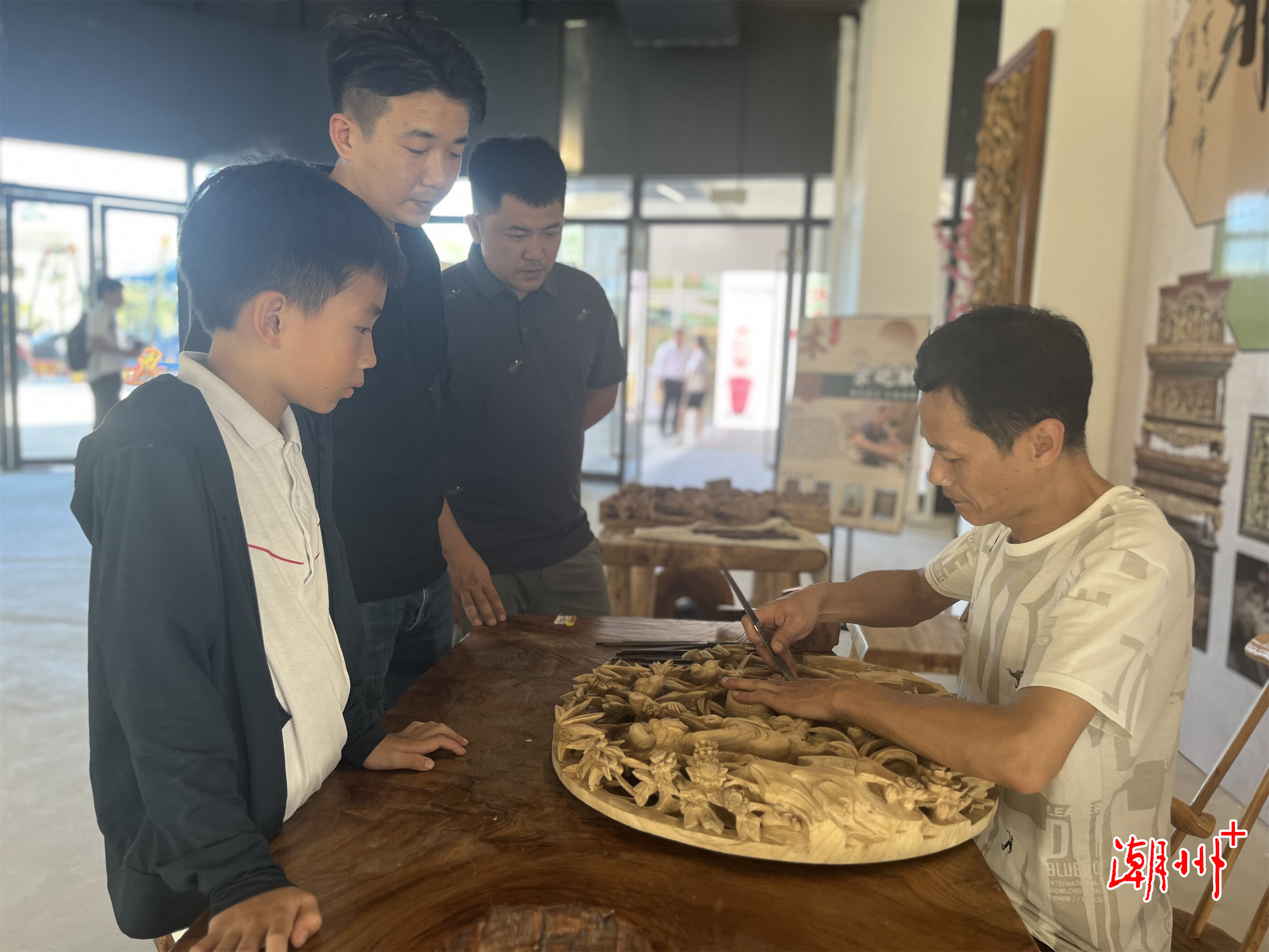 非遺展示區里,多位非遺傳承人和手藝人帶來木雕、嵌瓷、竹編、掐絲琺瑯等非遺工藝作品,現場向游客展示技藝,在一雙雙巧手下,由陶瓷、木頭、竹篾制作出來的作品充滿創造力。嵌瓷非遺傳承人蔡炳烈向大家分享了嵌瓷的技藝特點,他希望借助這個平臺,激發大家的興趣,引起更多人對非遺文化的關注,讓更多學生和年輕人參與其中。
