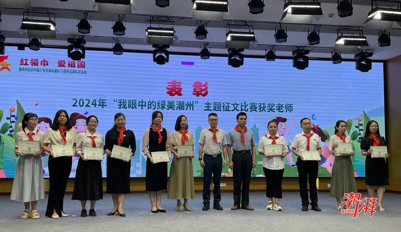 與會領導嘉賓為“我眼中的綠美潮州”主題征文比賽的獲獎教師代表頒獎。