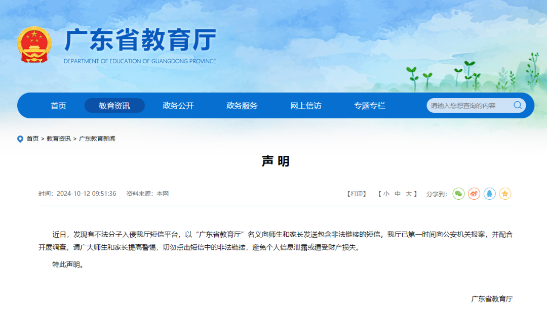 10月12日9時(shí)許,廣東省教育廳發(fā)布《聲明》。其中提到,近日發(fā)現(xiàn)有不法分子入侵廣東省教育廳短信平臺(tái),以“廣東省教育廳”名義向師生和家長發(fā)送包含非法鏈接的短信。省教育廳已第一時(shí)間向公安機(jī)關(guān)報(bào)案,并配合開展調(diào)查。