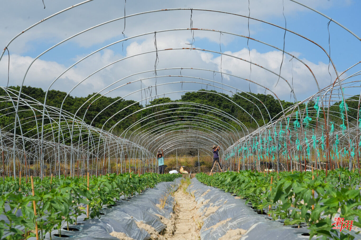 到了種植青椒的季節,農民在菜地里搭建大棚。
