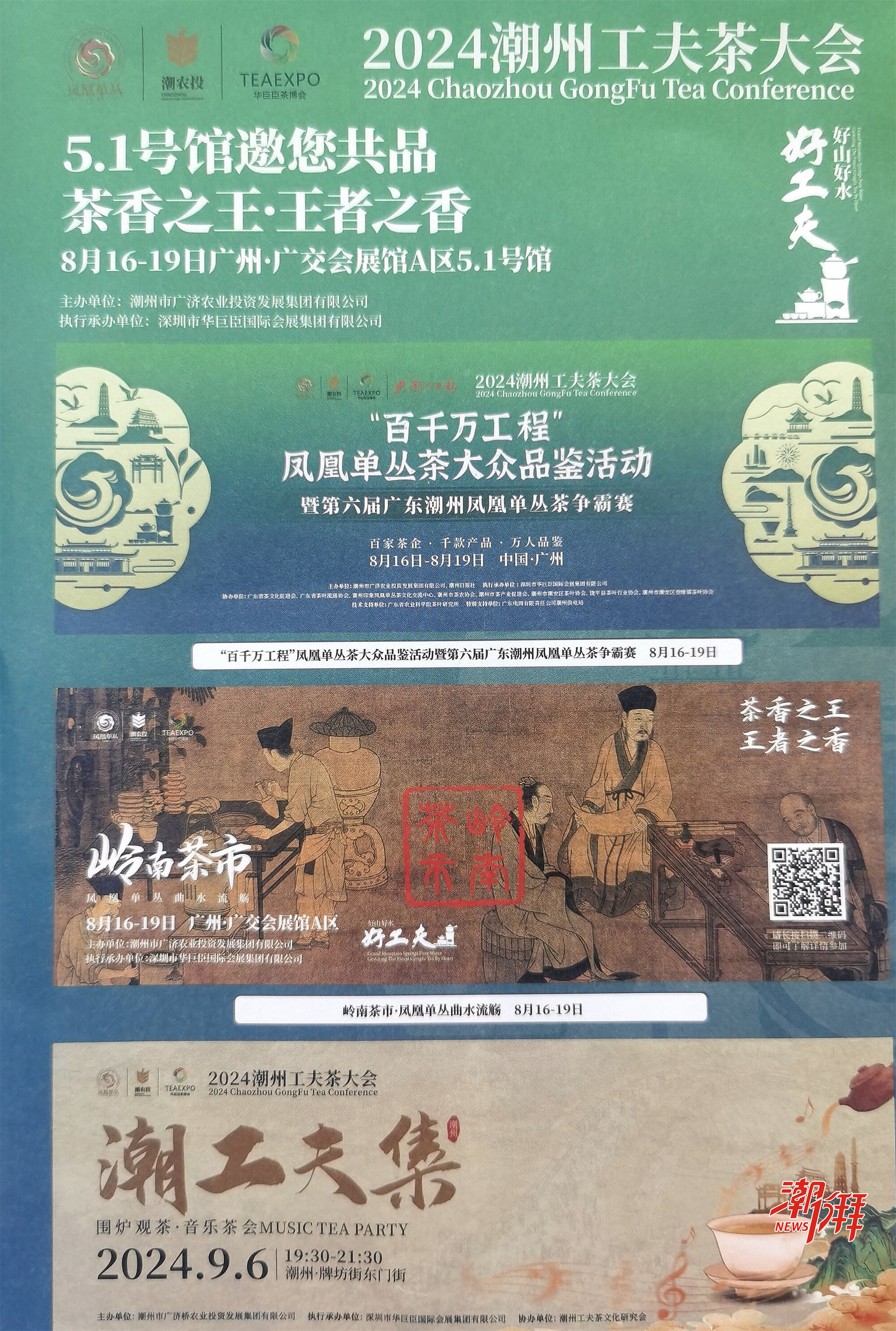今年,2024潮州工夫茶大會“走出來”辦展,以“好山好水好工夫”為主題,設置三大主題展區——鳳凰單叢茶展區、百叢爭茗品鑒區、茶文化活動區,舉辦“百千萬工程”鳳凰單叢茶大眾品鑒活動暨第六屆廣東潮州鳳凰單叢茶爭霸賽、嶺南茶市·鳳凰單叢曲水流觴等精彩活動,展示面積達2000㎡,60多家潮州優質茶企組團參展,鳳凰單叢茶及茶器具、茶食品、茶文創等產品琳瑯滿目,充分展現潮州茶產業發展成果。