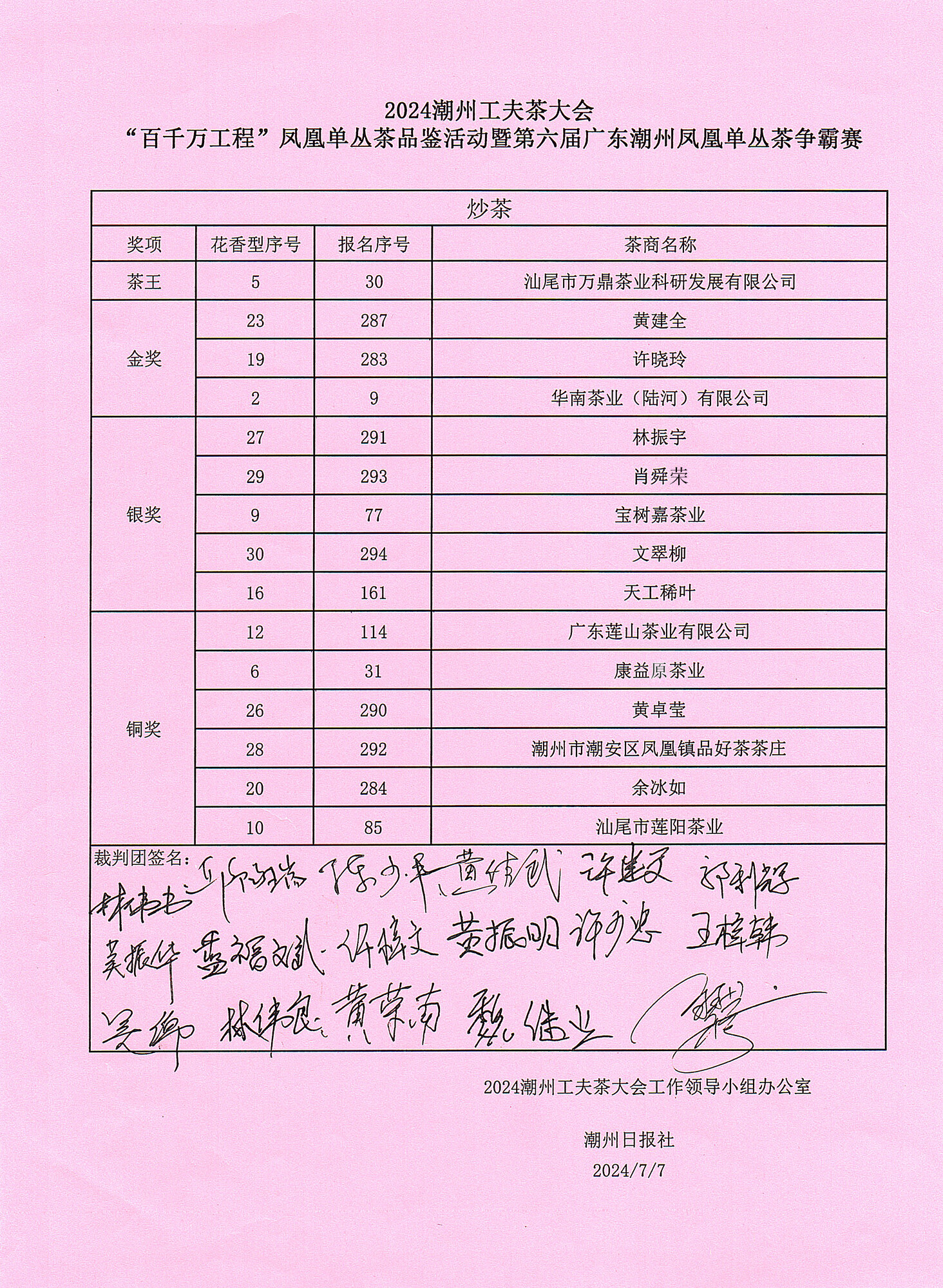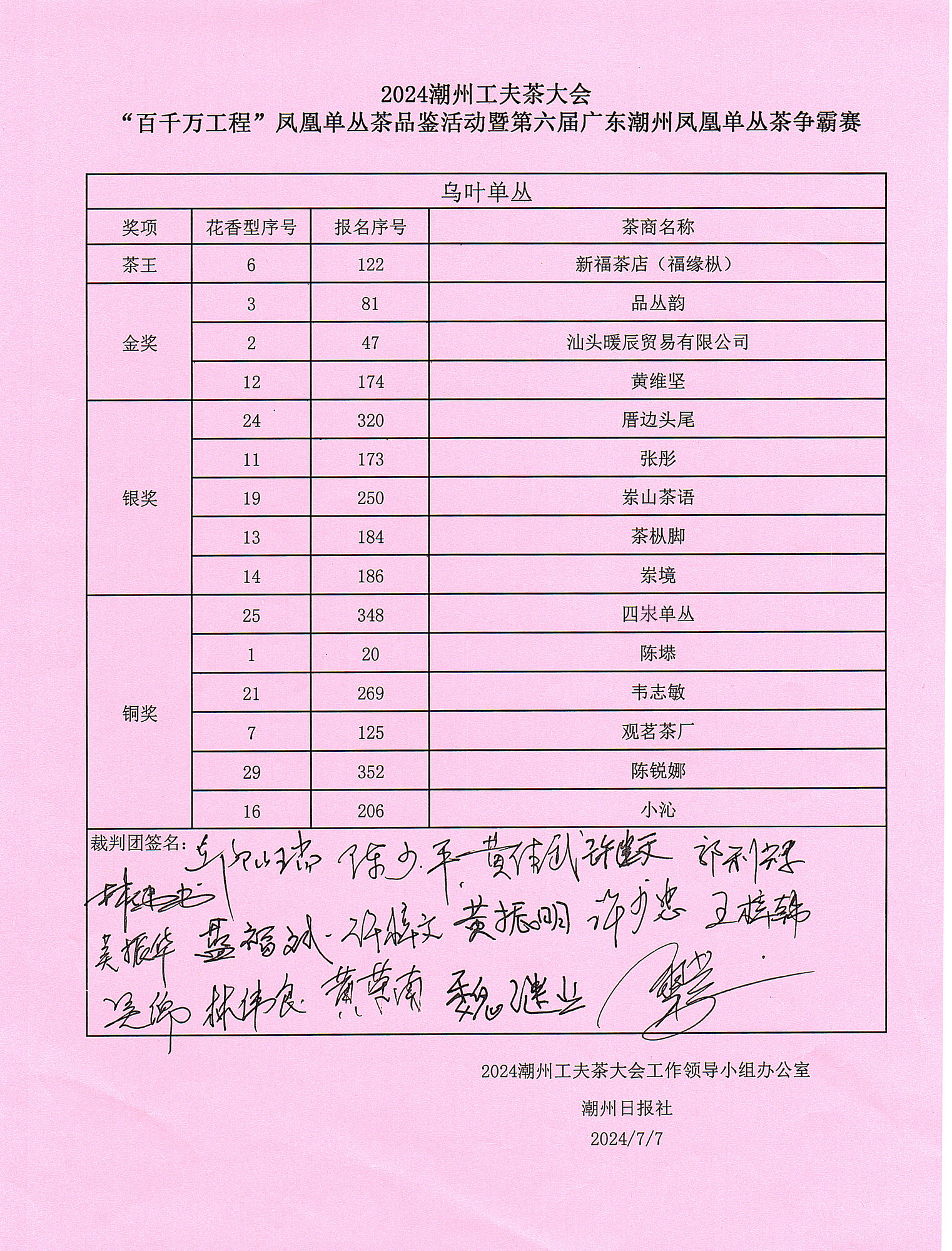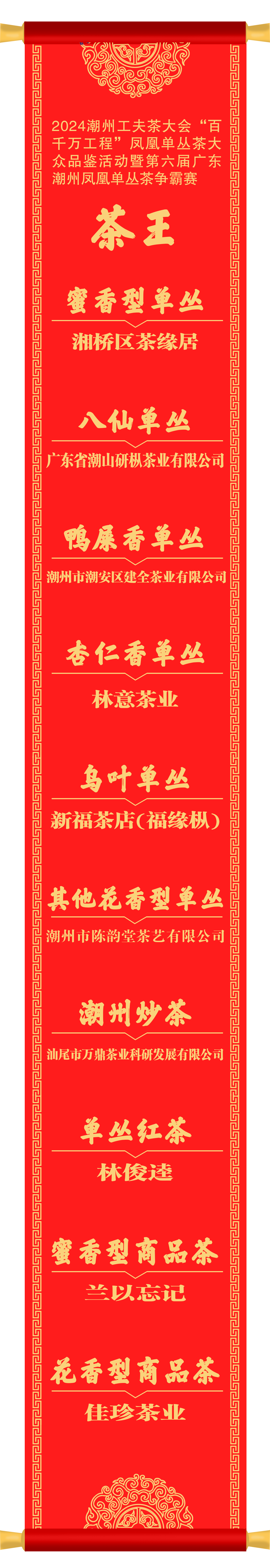 第六屆廣東潮州鳳凰單叢茶爭霸賽獲獎(jiǎng)名單公布如下: