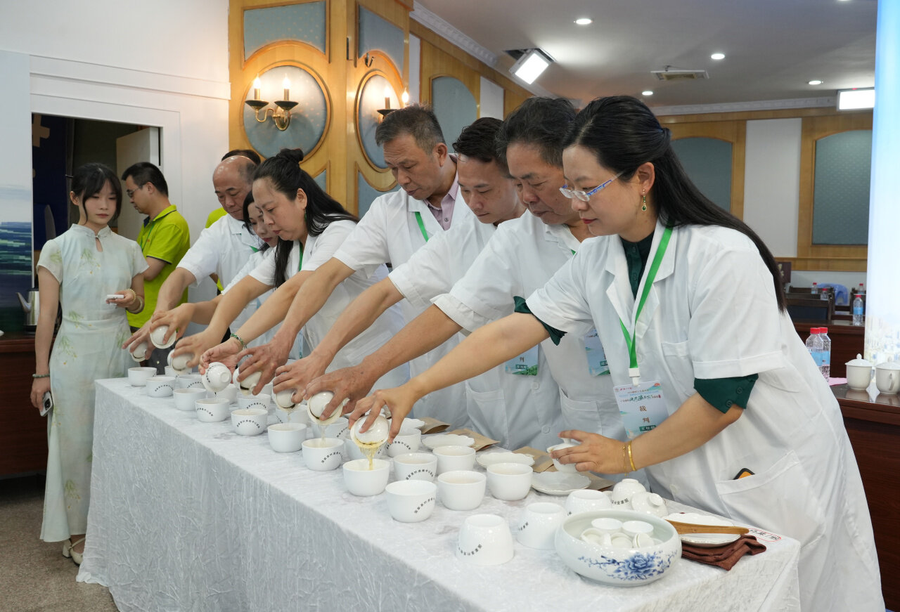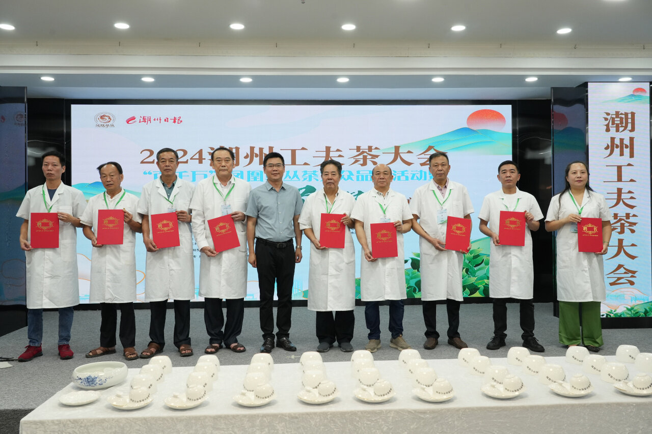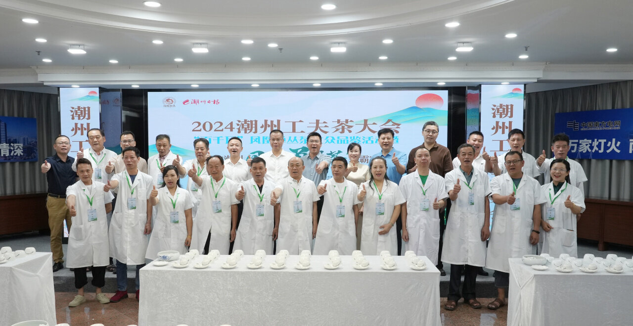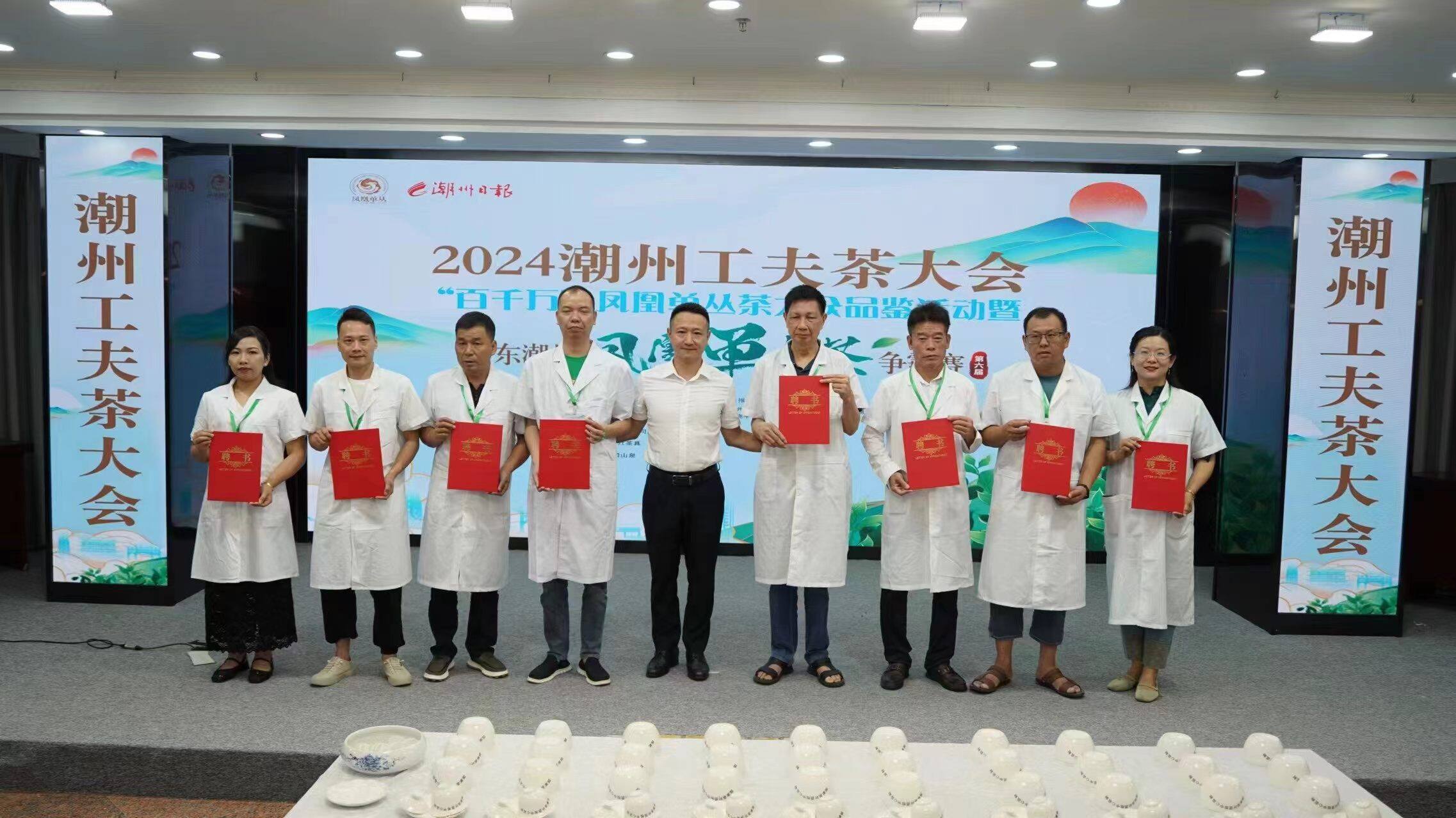 領(lǐng)導(dǎo)嘉賓及大賽評委為2024潮州工夫茶大會“百千萬工程”鳳凰單叢茶大眾品鑒活動暨第六屆廣東潮州鳳凰單叢茶爭霸賽點贊。