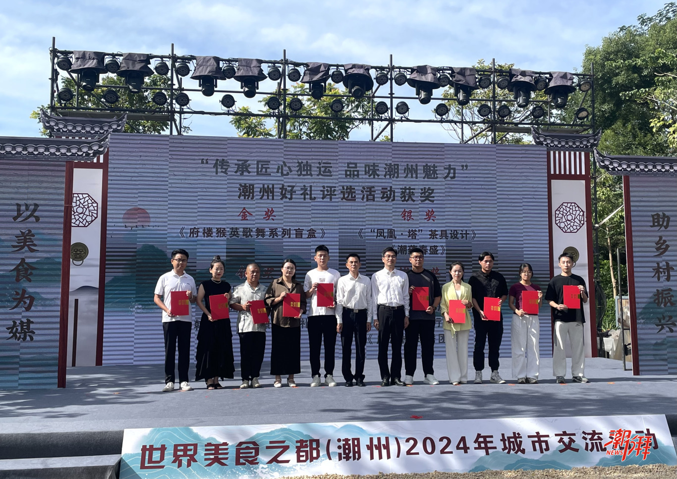 活動一經啟動便得到潮州各鎮(街)、高校、企業以及非遺手藝人等的廣泛關注和踴躍投稿,共征集到作品約400件。經專家初評、復評等程序,最終評選出金獎1名、銀獎2名、銅獎3名、優秀獎4名、創意獎20名、入圍獎70名。其中,《府樓猴英歌舞系列盲盒》獲得金獎,《“鳳凰·塔”茶具設計》《潮蘊春盛》獲得銀獎,《喜上“梅”梢》香牌、《振園潮州三寶》《韓江水·八景情》禮盒獲得銅牌,潮州木雕《希望》迷你蝦蟹簍、《潮州盛禮,圍廬制造》《府樓猴隨行杯》《廣濟樓刺繡團扇》獲得優秀獎。