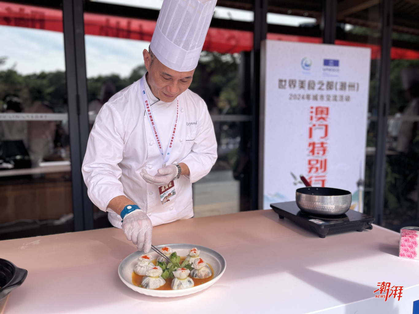 活動現場可謂色、香、味俱全。“炫技在潮州”——烹飪技藝交流區,來自世界美食之都成都、順德、澳門、揚州、淮安、潮州的廚師們大展身手,以精湛的烹飪技藝,展示各自城市獨特的美食文化,吸引了群眾駐足品鑒。江蘇淮揚菜集團行政總廚曹乃榮告訴記者,這是他第一次來到潮州,“潮州菜味道豐富,我對潮州砂鍋粥和鹵水印象深刻。”澳門銀河百樂潮州酒樓的主廚陳漢財則發揮創意,為觀眾帶來“金湯蒸菌石榴球”,以精細的制作工藝和菜品的視覺美感,希望讓更多人品嘗到澳門的潮州美食。他認為,活動不僅為大家提供了一個互相學習的好機會,也搭建起信息互通、優勢互補的平臺。