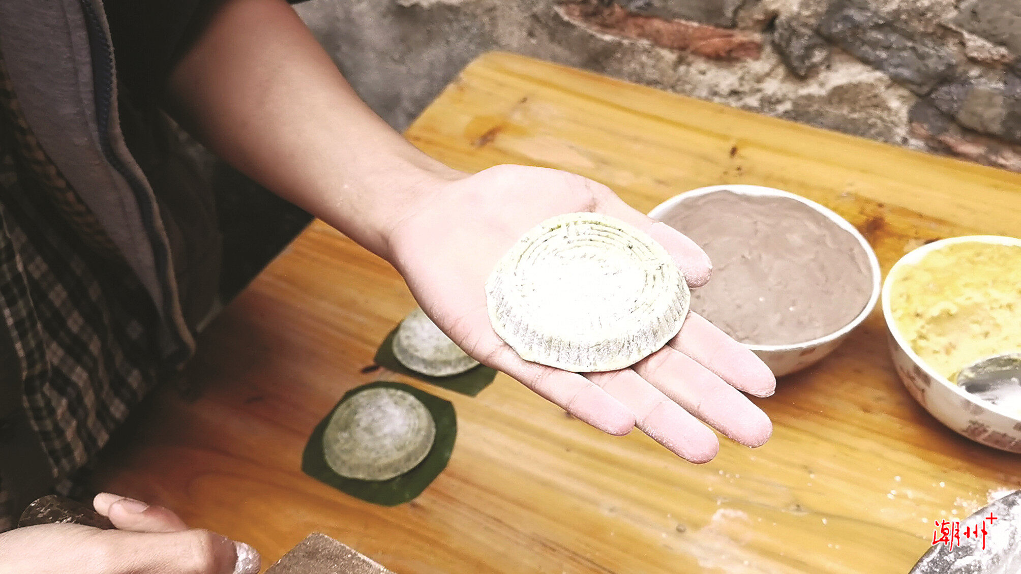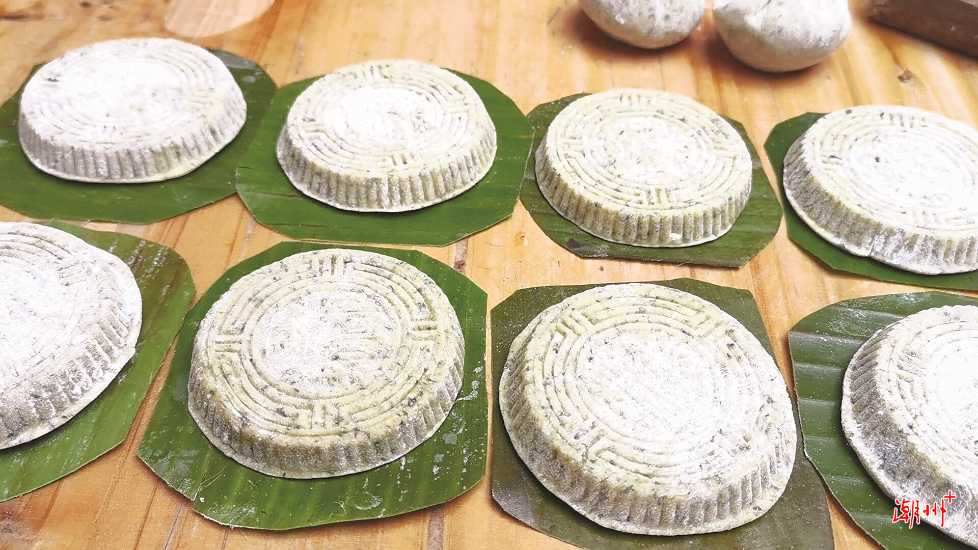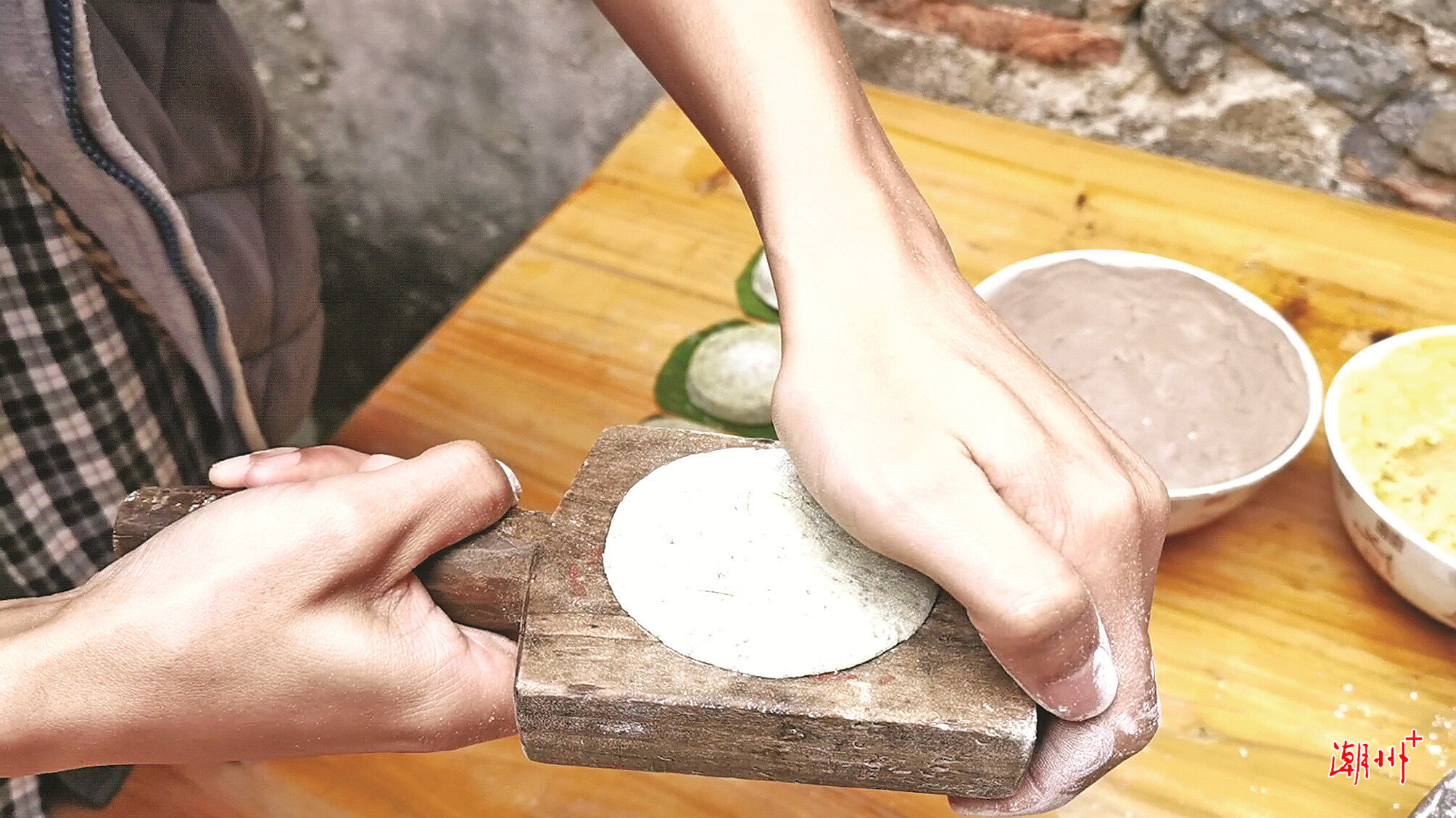 將它包裹成粿印大小的形狀,放入粿印按平,再倒扣取出鼠曲粿。做粿時,粿印要先灑點粉或者在粿皮外面裹粉,防止粿皮粘粿印。