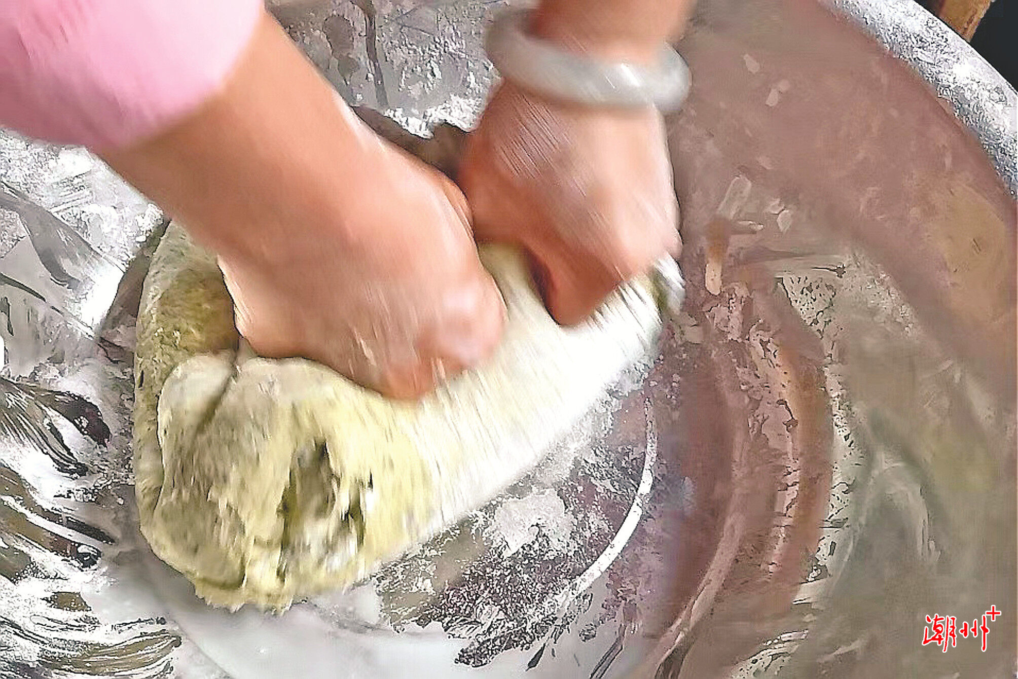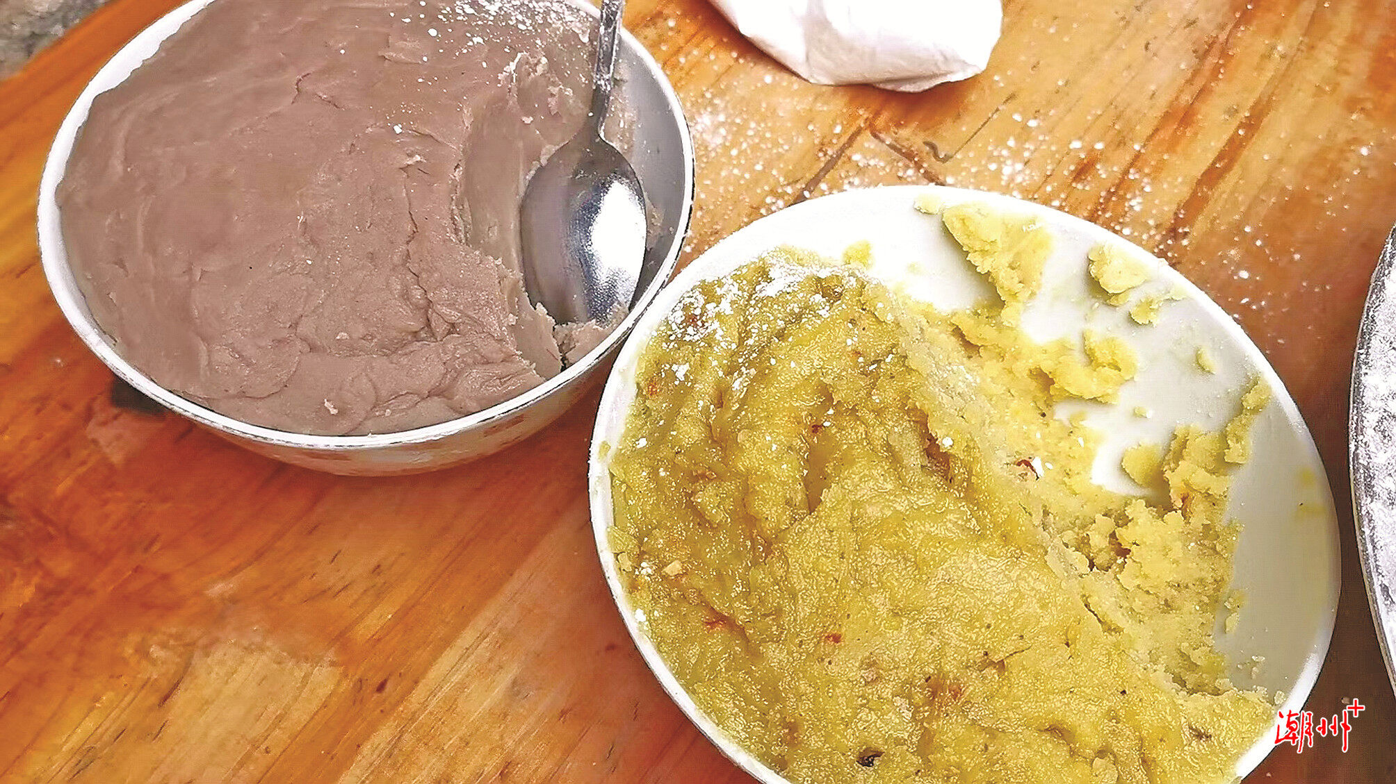 其次,要得到Q彈香軟的粿皮,還得添加番薯(紅薯)用作粿皮的原料。番薯淀粉含量比較高,能使粿皮更有韌勁。將番薯剝皮煮熟,壓碎成泥,與鼠曲草泥和勻,充分混合后按比例加入糯米粉勻火蒸一小會,再加糖,揉搓均勻,出鍋挪到大盆中搓揉至粿皮不粘手、可塑性強、光滑為止。整個和皮過程需使用開水,適量加水以保持粿皮的濕度。