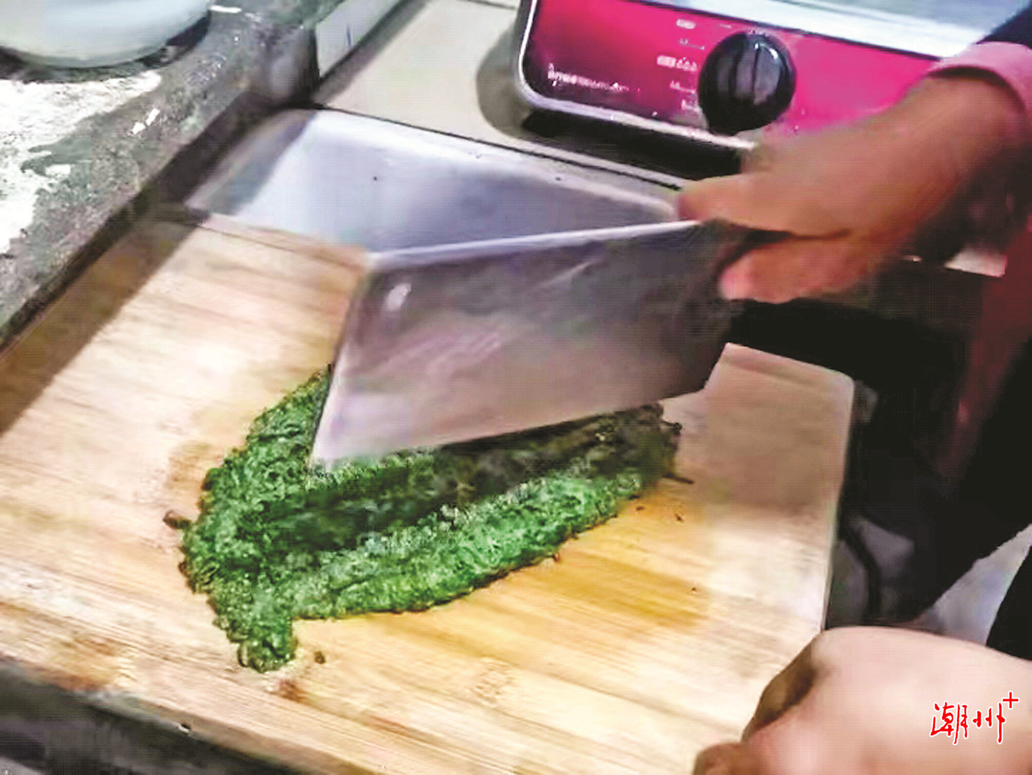 從田野里采摘回來的鼠曲草,經洗凈,用沸水燙熟,除去澀味,瀝干后,等待的是“千錘百煉”的考驗:用刀在刀墊上反復跺,直至成為細膩的草泥,熱油熬煮至爛熟。