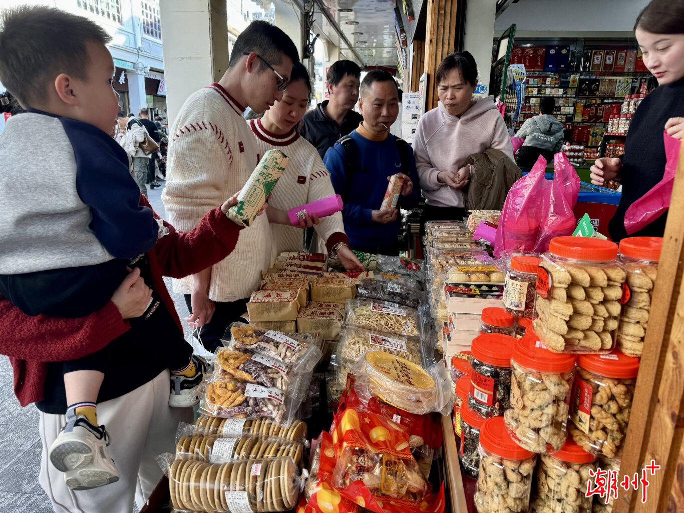 在牌坊街一家牛肉丸店前,一位游客正在試吃牛肉丸,店主楊先生細心地提醒游客:“小心燙,慢點吃?!眹L試過后,這位游客欣然決定購買6斤牛肉丸帶回家中。楊先生笑著說,春節長假不到兩天,他家就買了一百多斤牛肉丸,預計接下來幾天生意會更好。