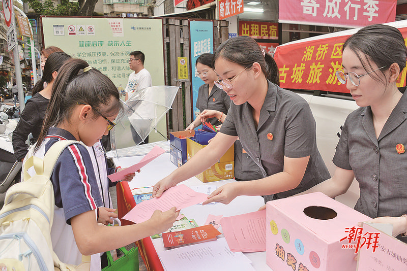 湘橋法院古城旅游巡回法庭在牌坊街舉辦“平安古城”主題普法活動,向青少年普法。