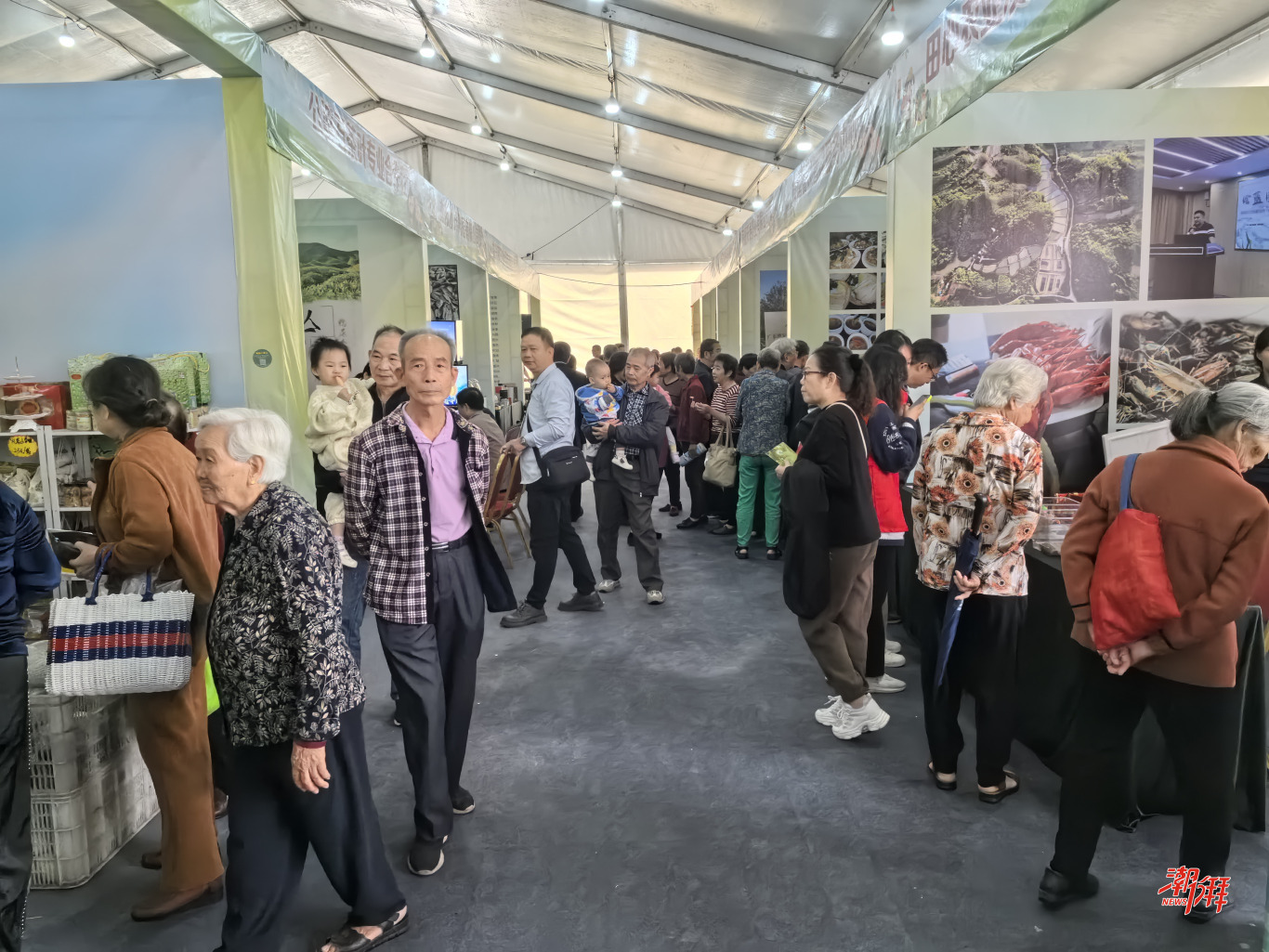 現場共設置43個展位,鹵鵝、梔棕、牛肉丸、寶斗餅、鳳凰單叢等特色農副產品琳瑯滿目,許多展區前人來人往,很是熱鬧。