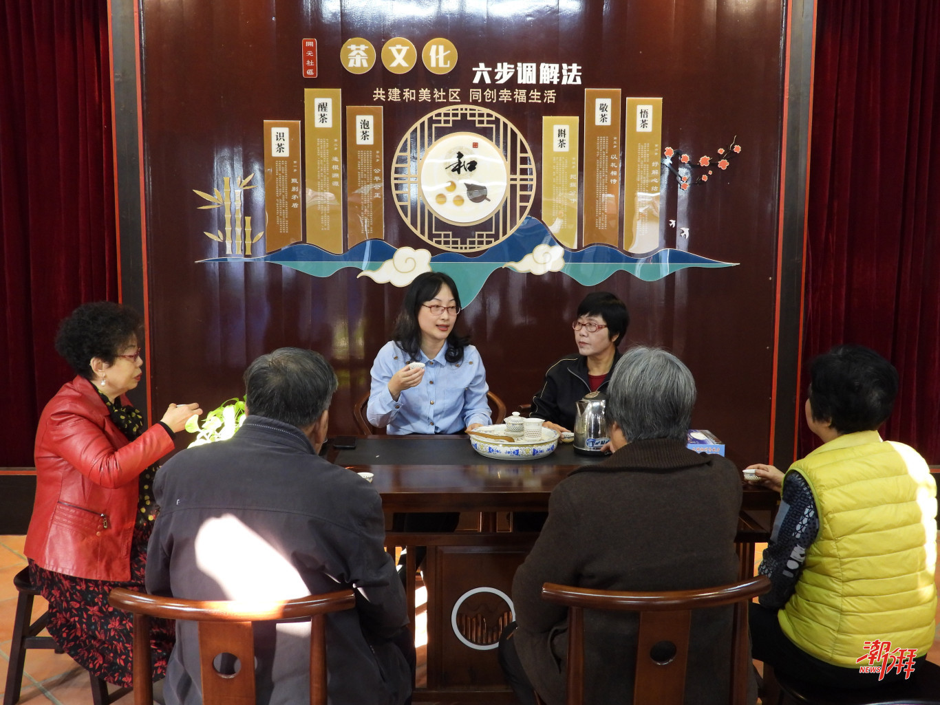 湘橋區社區群眾在居民議事廳內運用茶文化六步調解法開展調解工作。