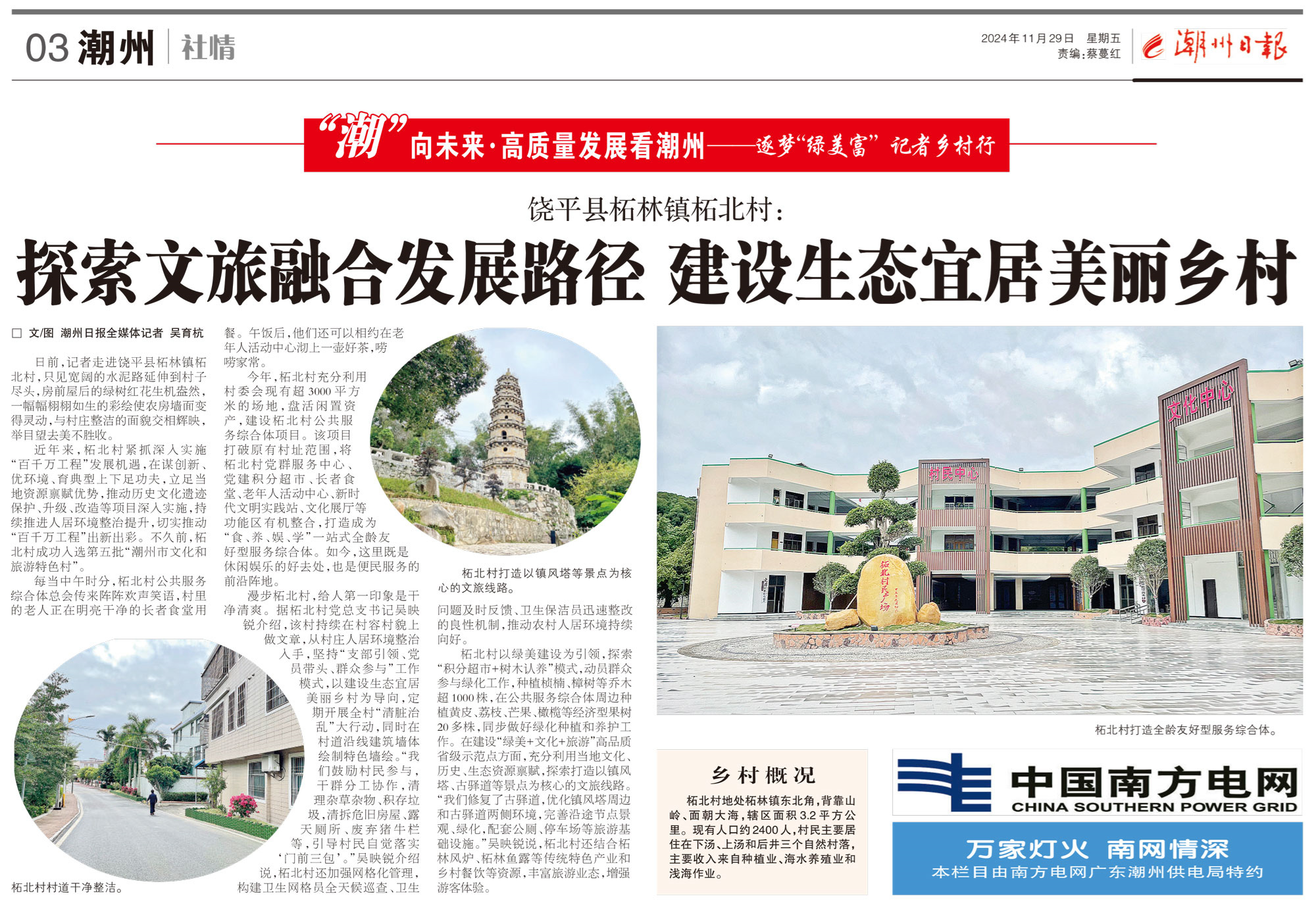柘北村以綠美建設(shè)為引領(lǐng),探索“積分超市+樹木認(rèn)養(yǎng)”模式,動(dòng)員群眾參與綠化工作,種植楨楠、樟樹等喬木超1000株,在公共服務(wù)綜合體周邊種植黃皮、荔枝、芒果、橄欖等經(jīng)濟(jì)型果樹20多株,同步做好綠化種植和養(yǎng)護(hù)工作。在建設(shè)“綠美+文化+旅游”高品質(zhì)省級(jí)示范點(diǎn)方面,充分利用當(dāng)?shù)匚幕v史、生態(tài)資源稟賦,探索打造以鎮(zhèn)風(fēng)塔、古驛道等景點(diǎn)為核心的文旅線路。“我們修復(fù)了古驛道,優(yōu)化鎮(zhèn)風(fēng)塔周邊和古驛道兩側(cè)環(huán)境,完善沿途節(jié)點(diǎn)景觀、綠化,配套公廁、停車場(chǎng)等旅游基礎(chǔ)設(shè)施。”吳映銳說(shuō),柘北村還結(jié)合柘林風(fēng)爐、柘林魚露等傳統(tǒng)特色產(chǎn)業(yè)和鄉(xiāng)村餐飲等資源,豐富旅游業(yè)態(tài),增強(qiáng)游客體驗(yàn)。