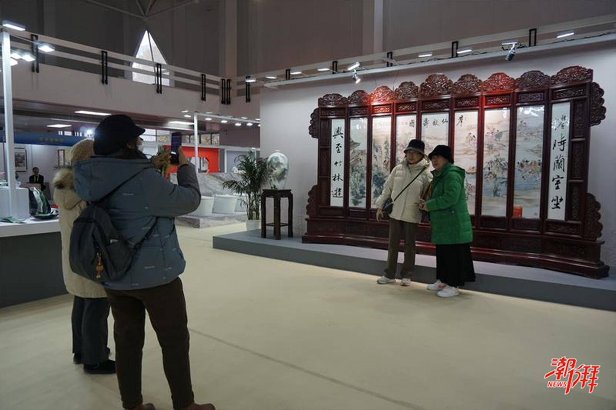 “這個瓷板畫很特別,非常大氣,寓意也很好!”在占據展館C位的瓷板畫《群仙慶壽圖》前,北京市民王女士正與好友拍照留念。這幅長4米、高2.4米的瓷板畫以屏風的形式展現,繪畫內容參考了清代畫家的部分素材,通過潮彩技巧,運用工筆畫細膩地畫出了40多個不同人物形象,線條流暢,魅力十足。