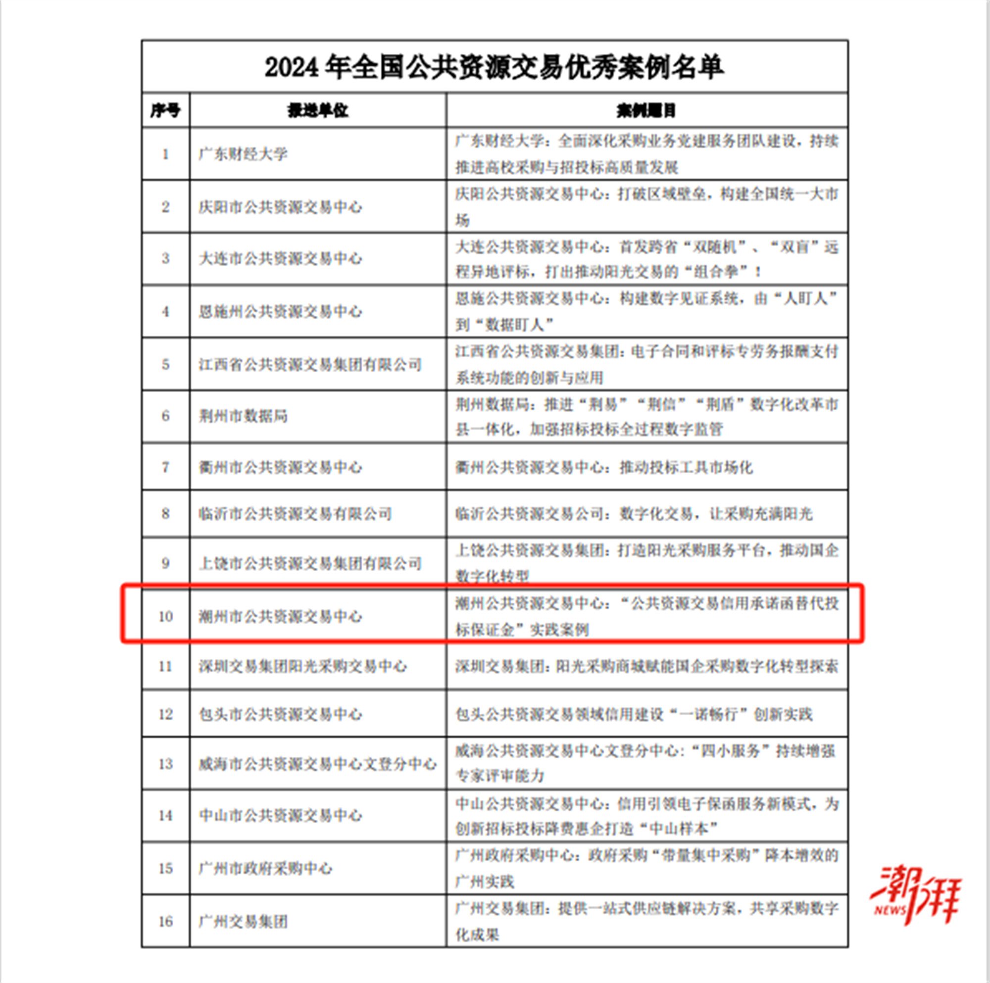 12月4日,在第十屆全國公共資源交易論壇現場,潮州市公共資源交易中心“公共資源交易信用承諾函替代投標保證金”實踐案例成功入選中國物流與采購聯合會公共采購分會公布的2024年度全國公共采購——公共資源交易領域優秀案例,成為全國16個入選案例之一。