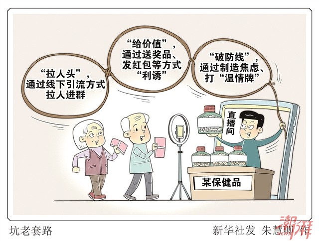 第一步是“拉人頭”,通過線下引流方式拉人進群;第二步是“給價值”,通過送獎品、發紅包等方式“利誘”;第三步是“破防線”,通過制造焦慮、打“溫情牌”,讓老人心甘情愿在直播間下單。