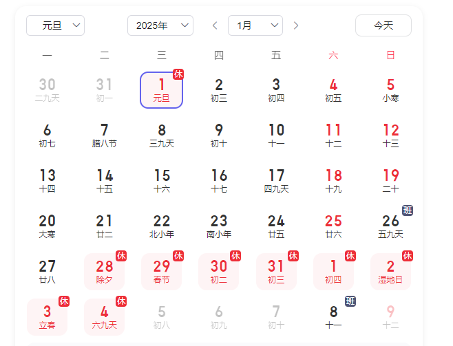 按照上述原則,現(xiàn)將2025年元旦、春節(jié)、清明節(jié)、勞動節(jié)、端午節(jié)、中秋節(jié)和國慶節(jié)放假調(diào)休日期的具體安排通知如下。