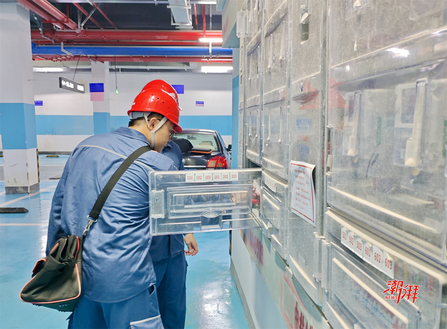 供電局工作人員到住宅小區地下車庫對充電樁專用電表表箱開展安全用電檢查。