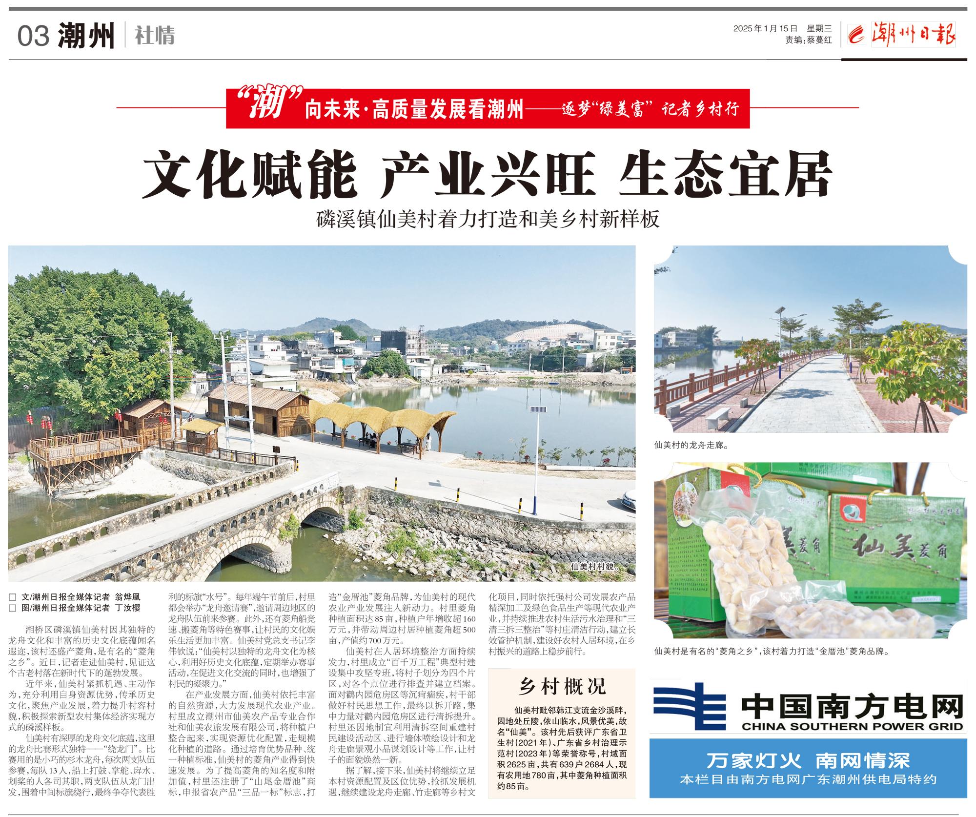 湘橋區磷溪鎮仙美村因其獨特的龍舟文化和豐富的歷史文化底蘊聞名遐邇,該村還盛產菱角,是有名的“菱角之鄉”。近日,記者走進仙美村,見證這個古老村落在新時代下的蓬勃發展。