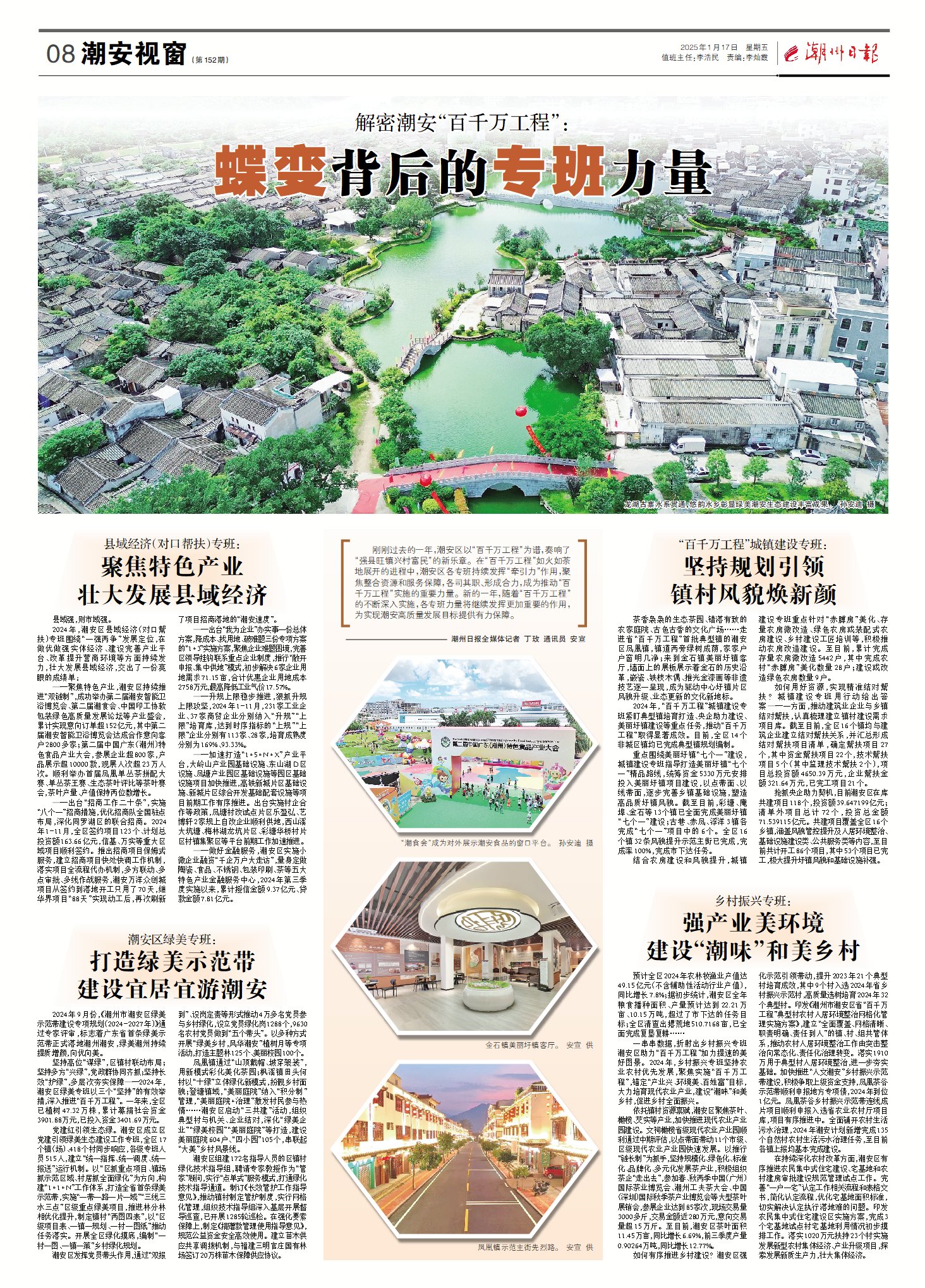 一串串數據,折射出鄉村振興專班潮安區助力“百千萬工程”加力提速的美好圖景。2024年,鄉村振興專班堅持農業農村優先發展,聚焦實施“百千萬工程”,錨定“產業興、環境美、百姓富”目標,大力培育現代農業產業,建設“潮味”和美鄉村,促進鄉村全面振興。