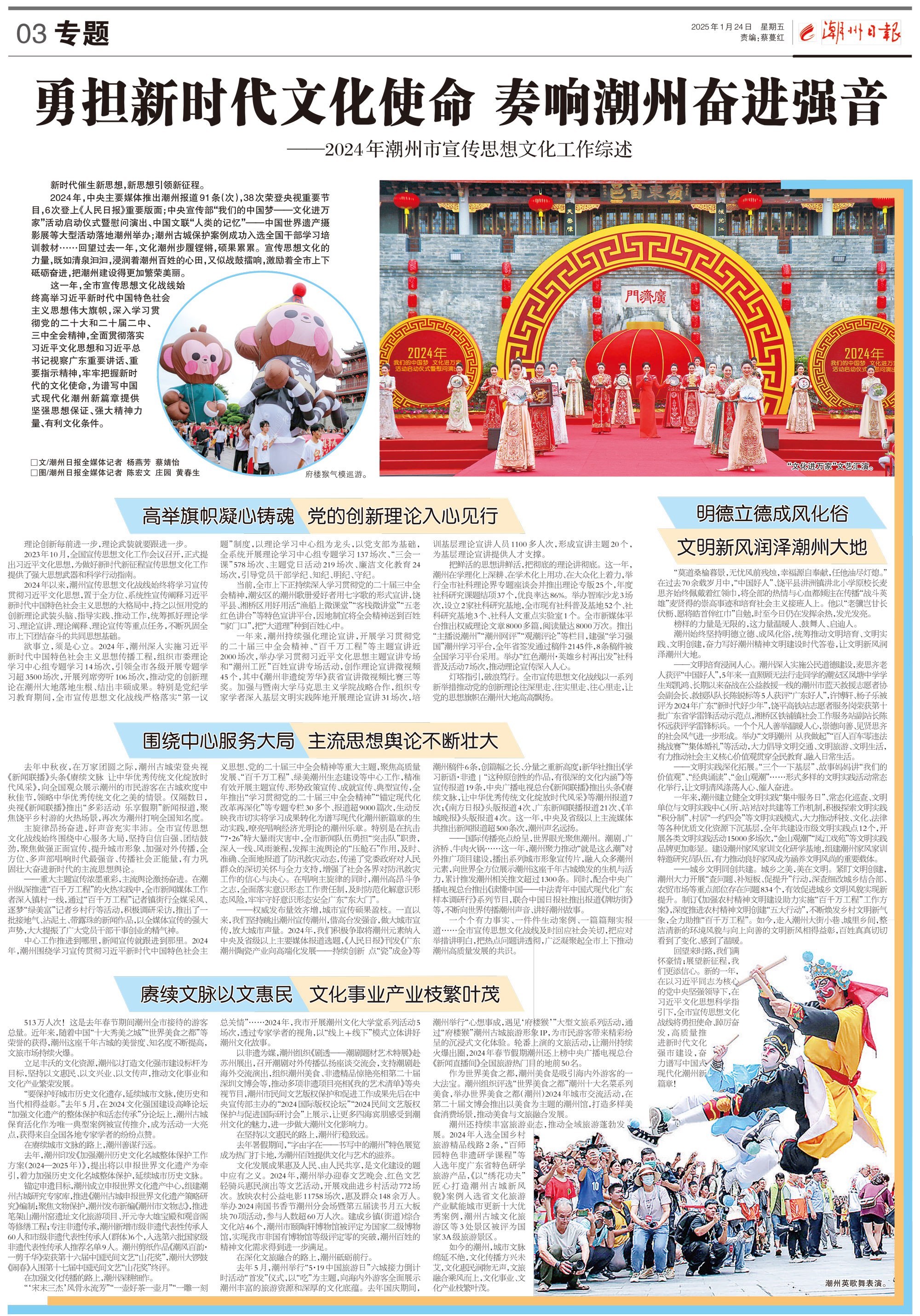這一年,全市宣傳思想文化戰(zhàn)線始終高舉習(xí)近平新時(shí)代中國(guó)特色社會(huì)主義思想偉大旗幟,深入學(xué)習(xí)貫徹黨的二十大和二十屆二中、三中全會(huì)精神,全面貫徹落實(shí)習(xí)近平文化思想和習(xí)近平總書記視察廣東重要講話、重要指示精神,牢牢把握新時(shí)代的文化使命,為譜寫中國(guó)式現(xiàn)代化潮州新篇章提供堅(jiān)強(qiáng)思想保證、強(qiáng)大精神力量、有利文化條件。