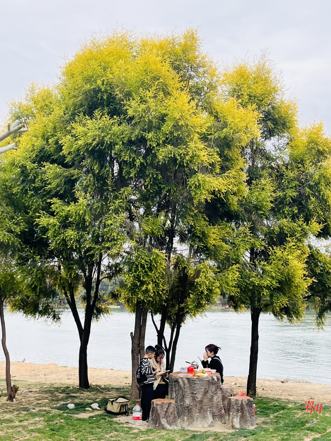 市民游客在官塘鎮鶴塘公園煮茶小聚,欣賞溪景。 陳瑩 攝
