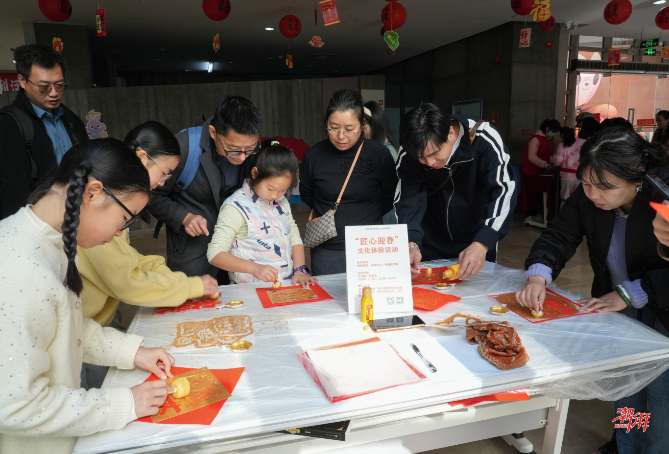 線上活動豐富多彩,線下活動也毫不遜色。回音幽遠——館藏明清繪畫精品展在市博物館二樓流動展廳精彩展出,一幅幅珍貴的明清繪畫作品展現出中國古代繪畫藝術的魅力,吸引不少市民游客駐足觀賞。“匠心迎春”文化體驗活動在一樓大廳同步舉行,其中拓印活動吸引了不少市民游客前來參與,只見大家在工作人員的指引下,把薄紙輕輕覆蓋在器物上,用刷子輕輕敲打,使紙張貼合器物紋理,再蘸墨小心捶拓,不一會兒,一張張精美的拓印福紙便逐漸成形,引得現場贊嘆聲不斷。“這個活動很有趣,以往過年都是直接購買現成的福紙,現在通過自己動手拓印,感覺更加有意義。”江西游客李文彬說。