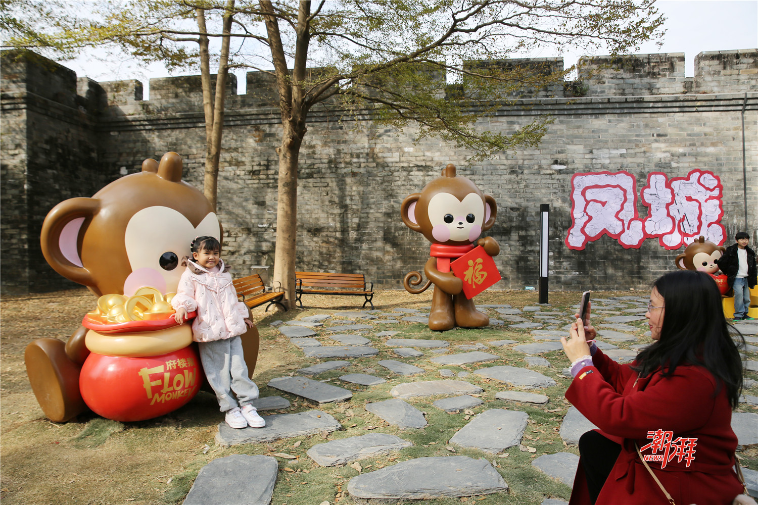 鳳凰洲公園里造型各異的“府樓猴”氣模,天水路邊靈動可愛的“府樓猴”雕塑,古城墻上英歌舞形象的“府樓猴”,牌坊街上以“府樓猴”為主題的文創集市……春節期間,潮州“府樓猴”形象IP是古城文旅的一大亮點。