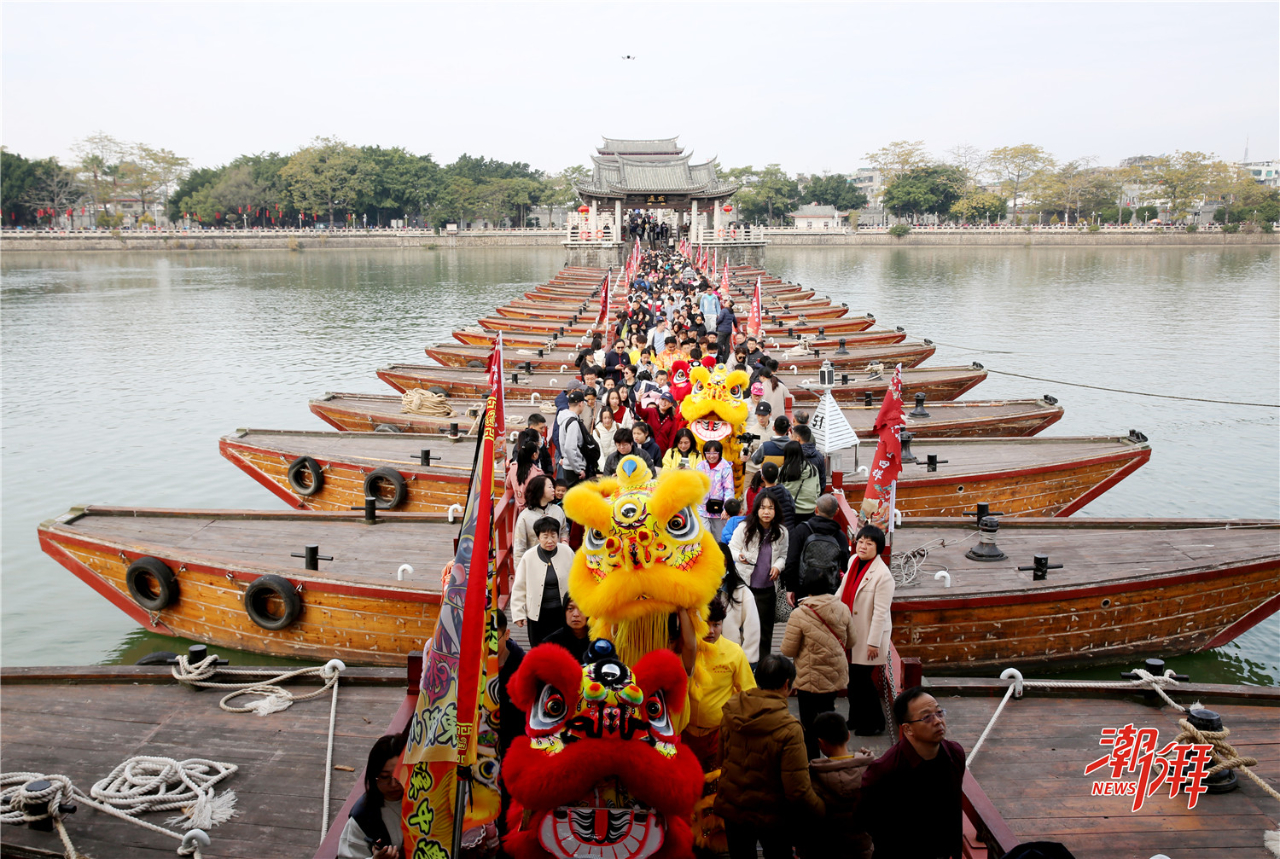 正月初一,潮州廣濟橋上熱鬧非凡。醒獅歡騰跳躍,與游客親切互動,傳遞著真摯的新春祝福。亭臺樓閣中,精美絕倫的木雕、潮繡,工藝精湛的手拉朱泥壺,向游客展示潮州傳統手工藝的獨特魅力。
