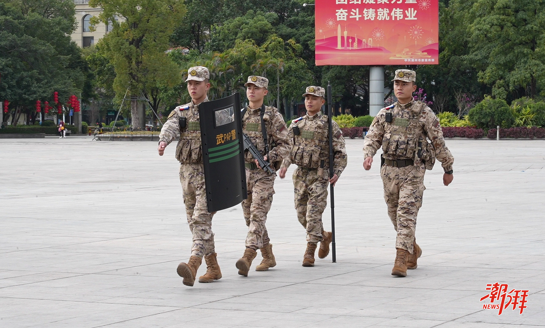 大年初五,在潮州市人民廣場,身著迷彩服的武警官兵手持警械,邁著整齊的步伐進行巡邏,個個精神抖擻、軍容嚴整?!按汗澕倨?,我們主要任務是開展武裝巡邏防控,防范打擊暴恐活動和個人極端事件?!蔽渚敝葜ш犇巢颗砰L李健介紹,同時他們面對節日人流激增的情況,還要時刻做好突發事故應急救援準備,保障人民群眾生命財產安全。