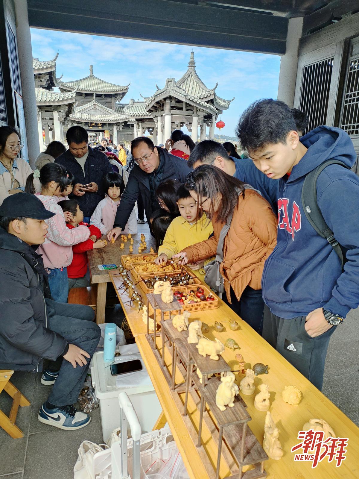 廣濟橋上的木雕工藝品吸引眾多游客的目光。 來源:潮湃新聞