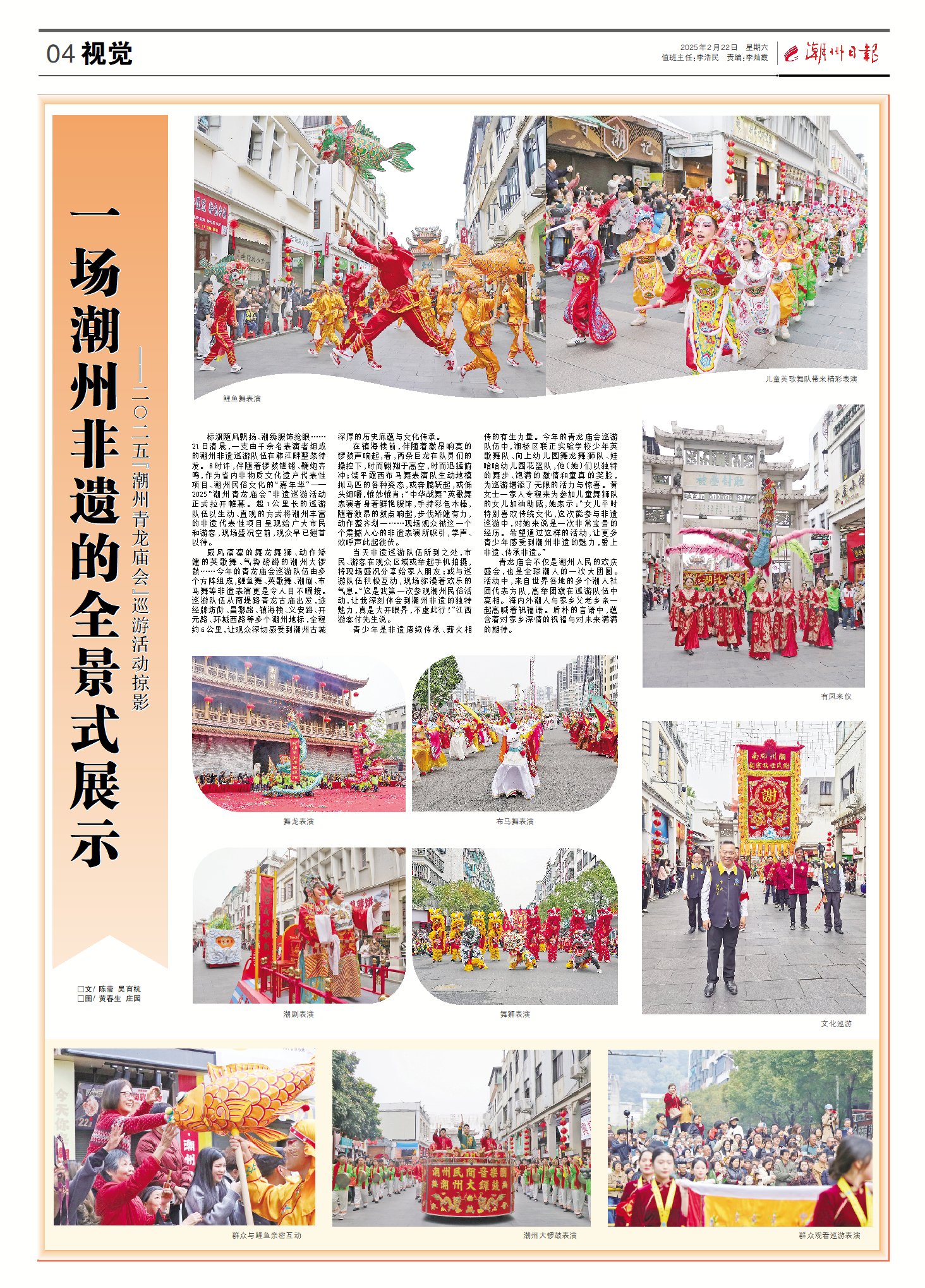 威風凜凜的舞龍舞獅、動作矯健的英歌舞、氣勢磅礴的潮州大鑼鼓……今年的青龍廟會巡游隊伍由多個方陣組成,鯉魚舞、英歌舞、潮劇、布馬舞等非遺表演更是令人目不暇接。巡游隊伍從南堤路青龍古廟出發,途經牌坊街、昌黎路、鎮海樓、義安路、開元路、環城西路等多個潮州地標,全程約6公里,讓觀眾深切感受到潮州古城深厚的歷史底蘊與文化傳承。
