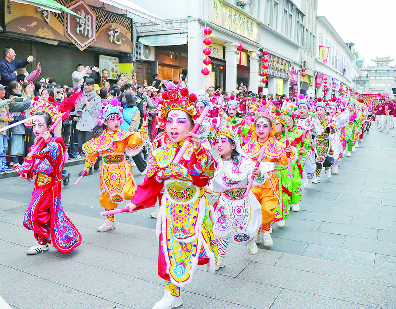 標旗隨風飄揚、潮繡服飾搶眼……21日清晨,一支由千余名表演者組成的潮州非遺巡游隊伍在韓江畔整裝待發。8時許,伴隨著鑼鼓鏗鏘、鞭炮齊鳴,作為省內非物質文化遺產代表性項目、潮州民俗文化的“嘉年華”——2025“潮州青龍廟會”非遺巡游活動正式拉開帷幕。超1公里長的巡游隊伍以生動、直觀的方式將潮州豐富的非遺代表性項目呈現給廣大市民和游客,現場盛況空前,觀眾早已翹首以待。