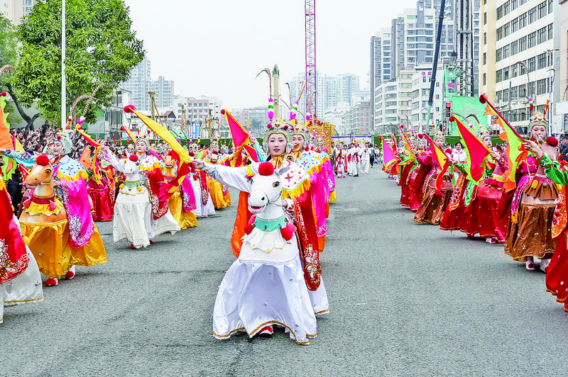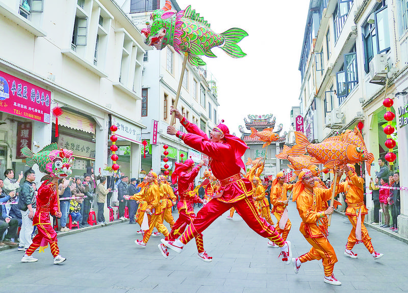 在鎮海樓前,伴隨著激昂響亮的鑼鼓聲響起,看,兩條巨龍在隊員們的操控下,時而翱翔于高空,時而迅猛俯沖;饒平霞西布馬舞表演隊生動地模擬馬匹的各種姿態,或奔騰躍起,或低頭細嚼,惟妙惟肖;“中華戰舞”英歌舞表演者身著鮮艷服飾,手持彩色木棒,隨著激昂的鼓點響起,步伐矯健有力,動作整齊劃一……現場觀眾被這一個個震撼人心的非遺表演所吸引,掌聲、歡呼聲此起彼伏。