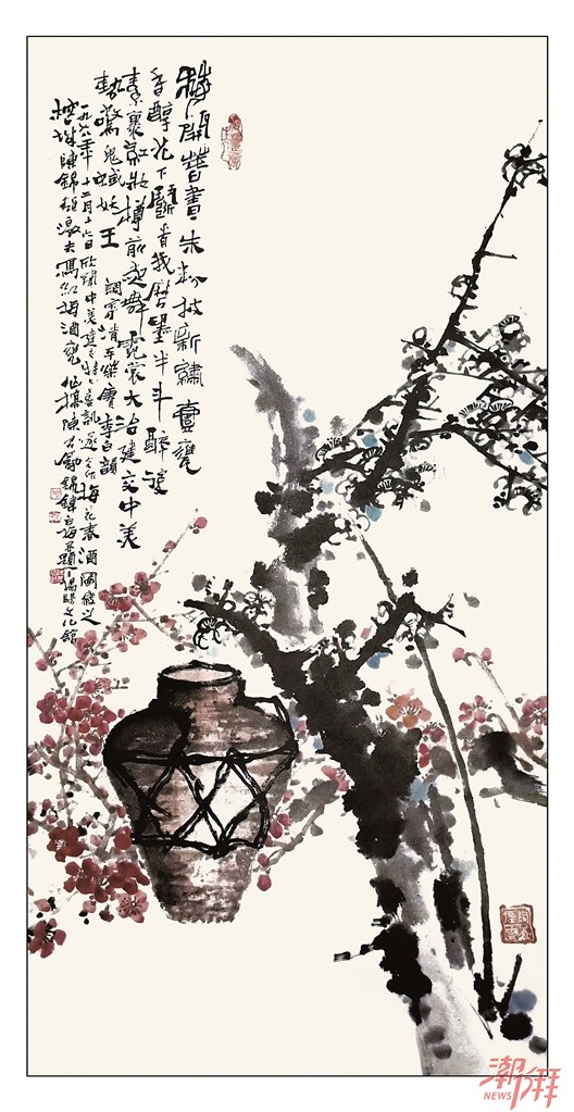 廣東省新聞出版局原局長羅宗海(潮州人,1935―2020年)在上世紀七十年末時任廣東《作品》雜志的負責人之一,在當年,《作品》是一份銳意創(chuàng)新、領潮流之先的文藝刊物。羅老師曾介紹說,1979年1月,當《作品》編輯部正準備發(fā)排第二期稿件之際,忽然接到一件國畫來稿,畫面上兩樹梅花,朱粉迎春,一甕美酒,醇香噴溢。左邊數行題跋:“梅開春晝,朱粉披新秀。壹甕香醇花下闕,看我磨墨半斗。醉中素裹紅妝, 樽前起舞霓裳。大治建交中美,勢驚鬼蜮妖王”。這是揭陽畫家陳君勵和陳錦雄欣聞中美建交特大喜訊,遂合作了這幅國畫《梅花春酒圖》,以祝賀這令人矚目的重大歷史事件。畫面的題跋是陳君勵步李白韻作的《清平樂》一首,他用篆隸真草,互相摻合,共冶一爐的書法題在畫上,但見:疏密肥瘦,自由揮灑,筆勢遒健,參差錯落,情趣盎然,論神酷似板橋;論形自見風姿,很惹人目。這幅來自榕水之濱的作者畫稿,古拙清雅,很有新意,使《作品》編輯同志十分欣賞,經研究一致同意,把原定封頁的畫稿換上這及時而來慶祝中美建交的《梅花春酒圖》。