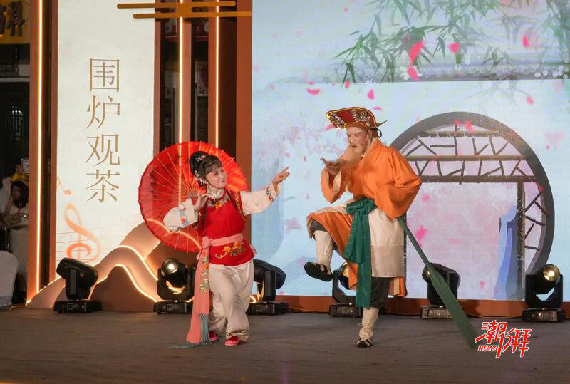 音樂茶會在鼓聲激昂的二十四節令鼓表演中拉開序幕。隨后,潮州非遺快閃鯉魚舞、潮劇蘇六娘選段《桃花過渡》、潮州箏《宋城茶韻》《出水蓮》等節目悉數亮相。“爐來起,茶來沖!”市文化旅游體育推廣大使郭元朝帶來潮語音樂《鋸冇弦》,與現場茶友熱情互動,將全場氣氛推向了高潮。