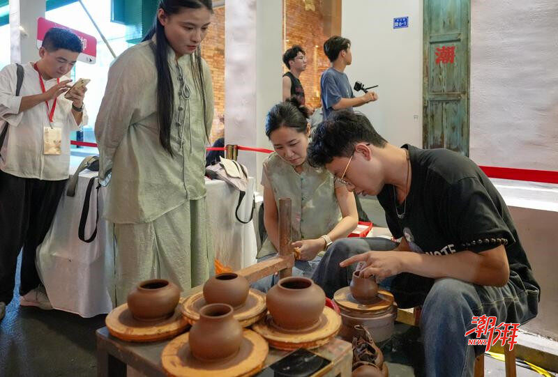 除了品茶聽曲,活動現場還特別打造了潮州非遺互動場景。在潮州剪紙體驗席,一張紅紙、一把剪刀在非遺傳承人的手中舞動,不一會兒,一幅幅栩栩如生的剪紙畫像躍然紙上。在手拉壺體驗席,工藝師手把手指導市民游客體驗手拉壺的拉坯工序。此外,大家還可以前往書法蒲扇體驗互動席,親手在潮州蒲扇上題字送祝福。市民劉先生和孩子一起體驗潮州剪紙。“這場活動很有意思,不僅可以讓孩子切身了解古城的歷史和文化,也可以體驗潮州剪紙,感受非遺的魅力。”劉先生說。