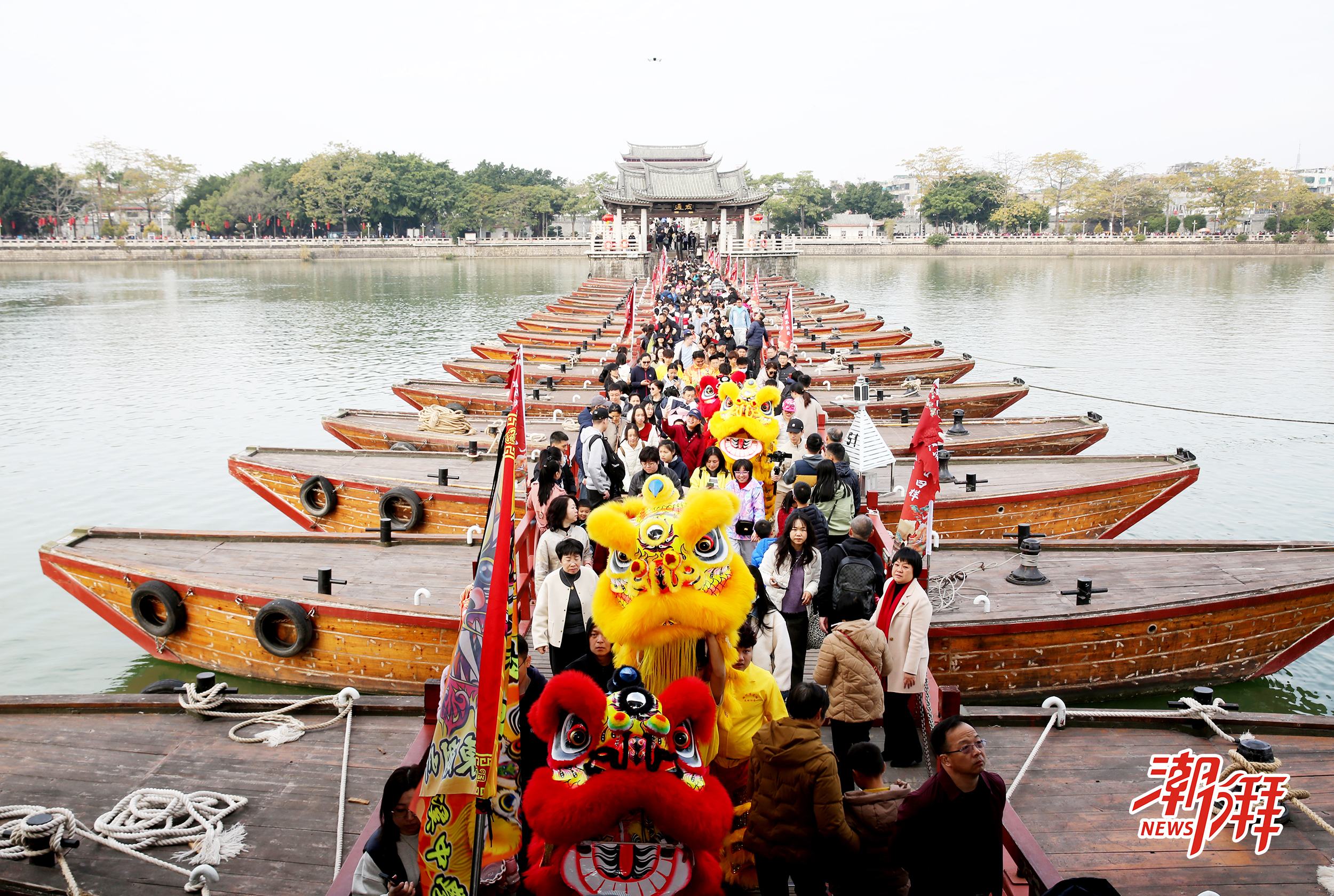 29日,廣濟橋上醒獅踏春活動現場人潮如織,處處洋溢著節日熱鬧喜慶氛圍。