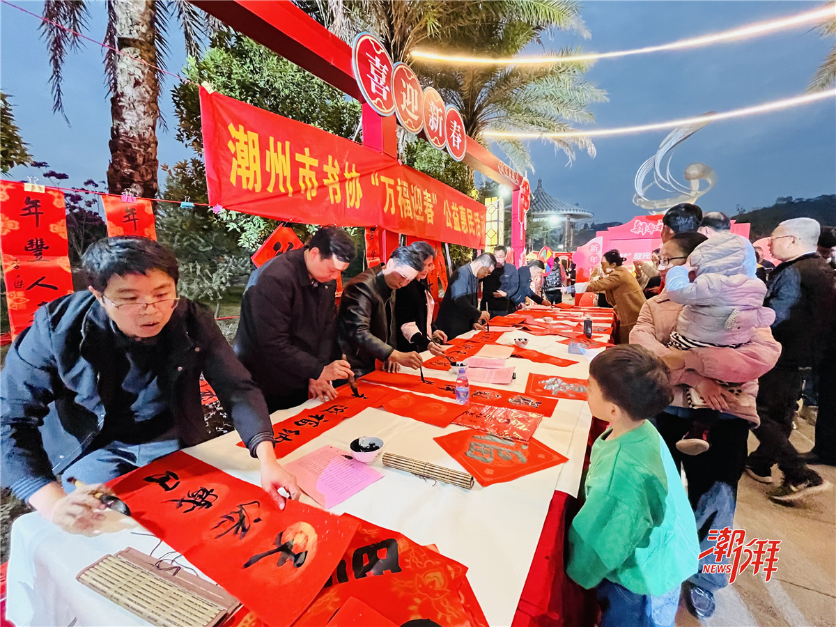 活動現(xiàn)場,除了精彩的文藝表演,還設(shè)置了寫春聯(lián)、猜燈謎及潮州非遺展區(qū)等趣味游園活動,吸引了社光村村民及周邊群眾參與,現(xiàn)場人頭攢動,熱鬧非凡。在春聯(lián)區(qū)域,書法愛好者們揮毫潑墨,寫春聯(lián)、“福”字,為村民送上新春的祝福;猜燈謎區(qū)域,村民們或低頭沉思、或相互討論,沉浸在歡樂的氛圍中;非遺展區(qū)則展示了潮州傳統(tǒng)手工藝和民俗文化,潮州木雕、潮州花燈、潮繡、潮州糖畫、潮州剪紙等12個(gè)非遺展區(qū),讓村民近距離感受潮州非遺魅力。