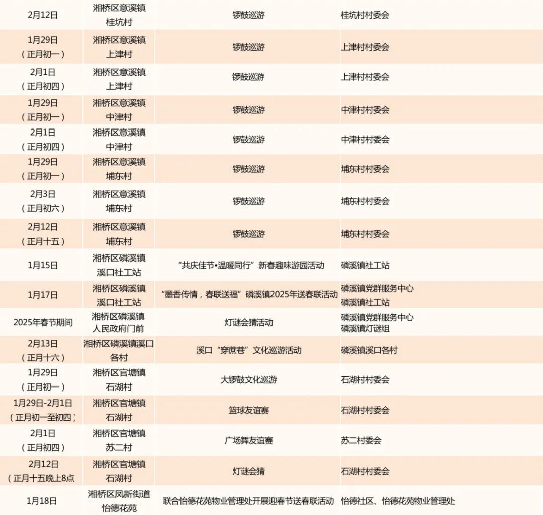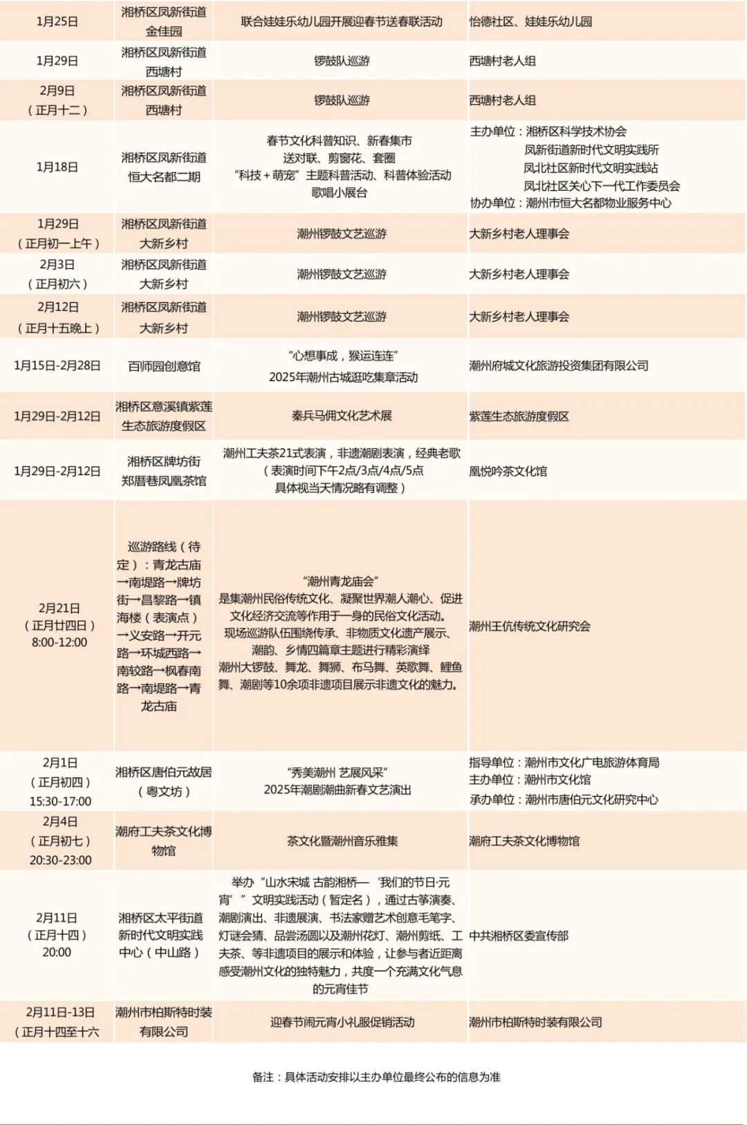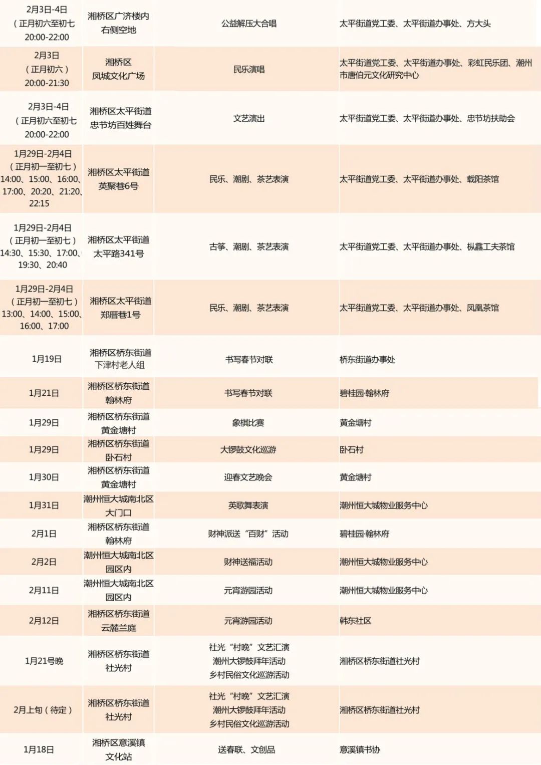 春節期間,湘橋鄉村各類民俗文化活動同樣豐富精彩,包括穿蔗巷、醒獅、英歌舞、大鑼鼓文藝巡游等特色活動?。這些活動不僅展示了潮州鄉村的獨特文化,也讓春節充滿了濃厚的年味?。
