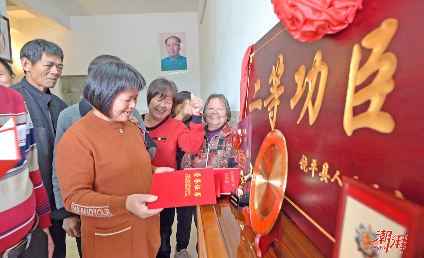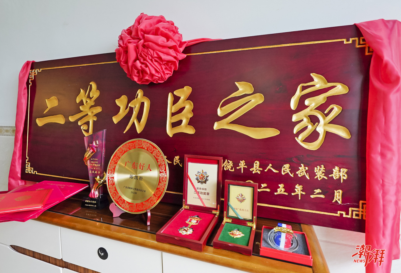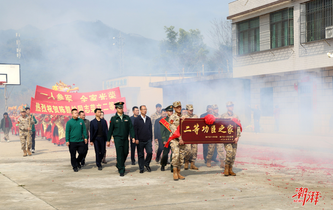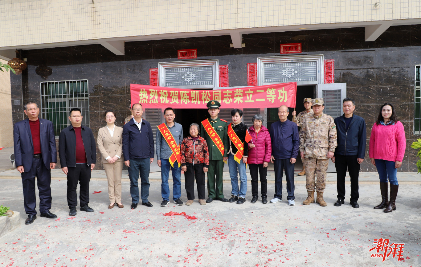 現(xiàn)場儀式感滿滿,送喜報(bào)隊(duì)伍一路擊鼓鳴鑼、燃點(diǎn)爆竹,高舉“一人立功,全家光榮”橫幅,高抬“二等功臣之家”牌匾,送到陳凱松家中,引得周邊群眾紛紛駐足圍觀。饒平縣有關(guān)領(lǐng)導(dǎo)將二等功牌匾鄭重地交到陳凱松家人手中,并為他們佩戴綬帶,送上立功喜報(bào)和慰問金,現(xiàn)場的親友眼中充滿了自豪,不少同鄉(xiāng)更是興奮地上前合影留念,共同分享這份喜悅,他們說:“陳凱松是部隊(duì)的好榜樣,也是桃西村的好后生!”