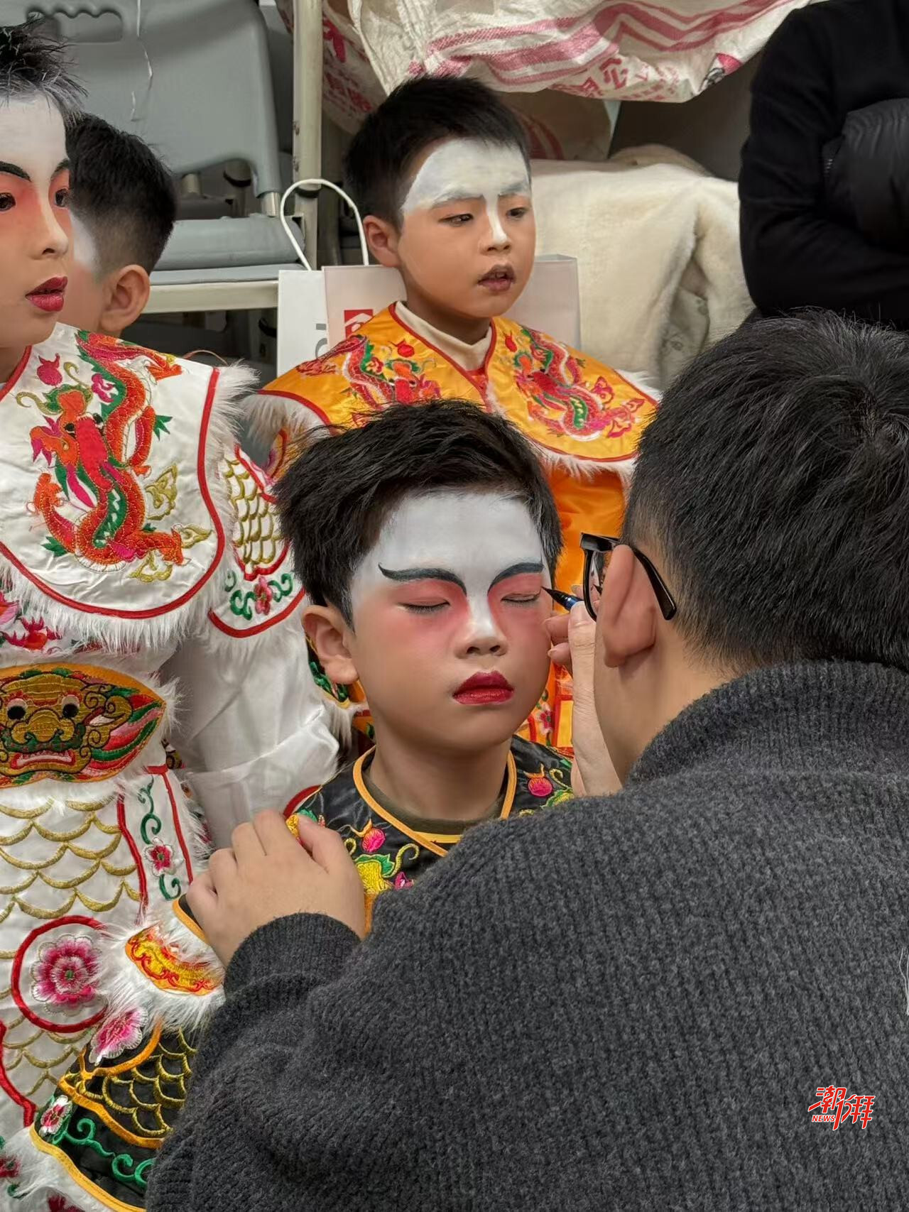 聯正實驗學校小學部的學生畫上英歌舞臉譜準備參加文化巡游。