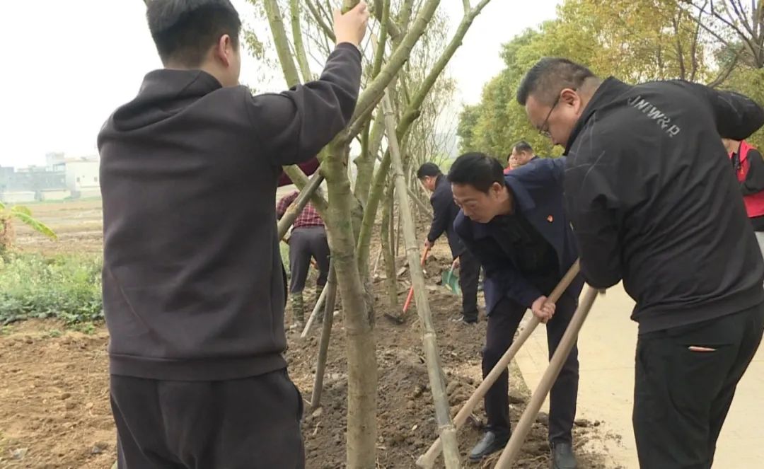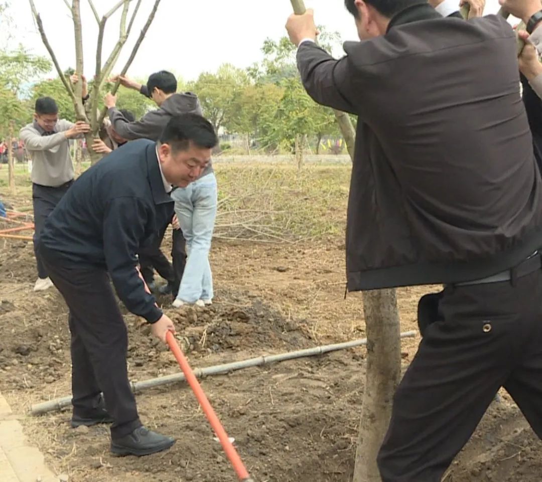 植樹現(xiàn)場,陳創(chuàng)陽與黨員干部精神抖擻,三五一組揮鍬鏟土、扶苗培土、提水澆灌,各個環(huán)節(jié)銜接有序、配合默契。經(jīng)過一番辛勤忙碌,一株株樹苗穩(wěn)穩(wěn)扎根昂然挺立,在明媚的春光中展現(xiàn)出勃勃生機。